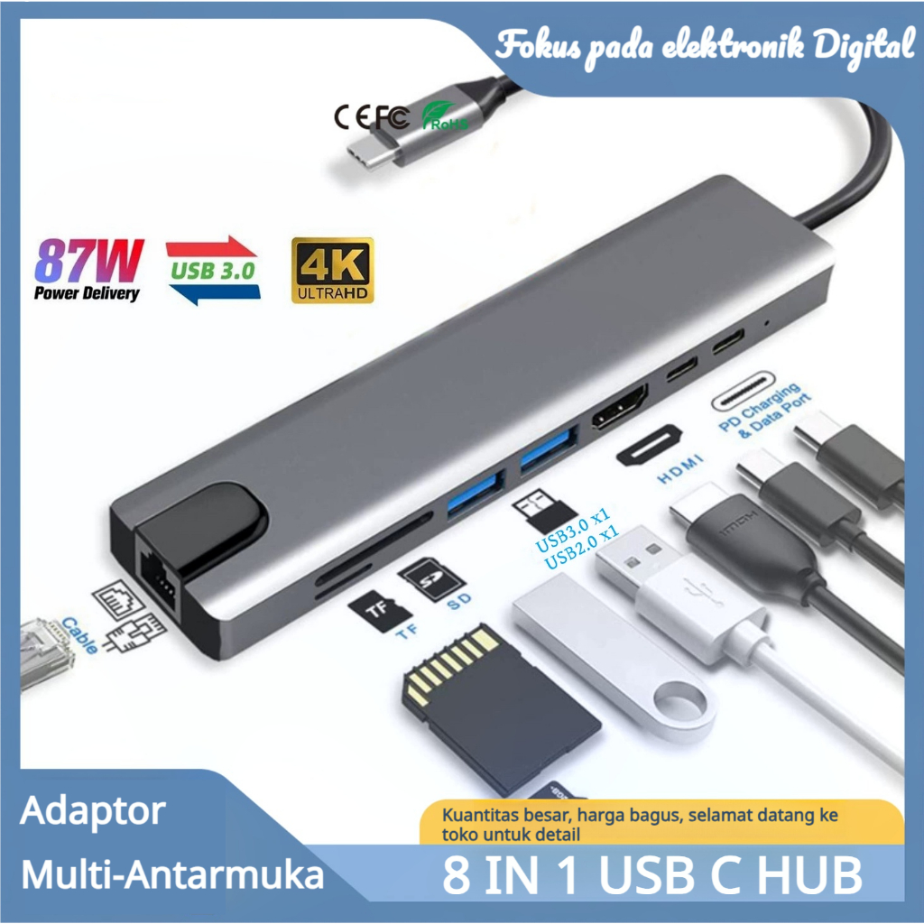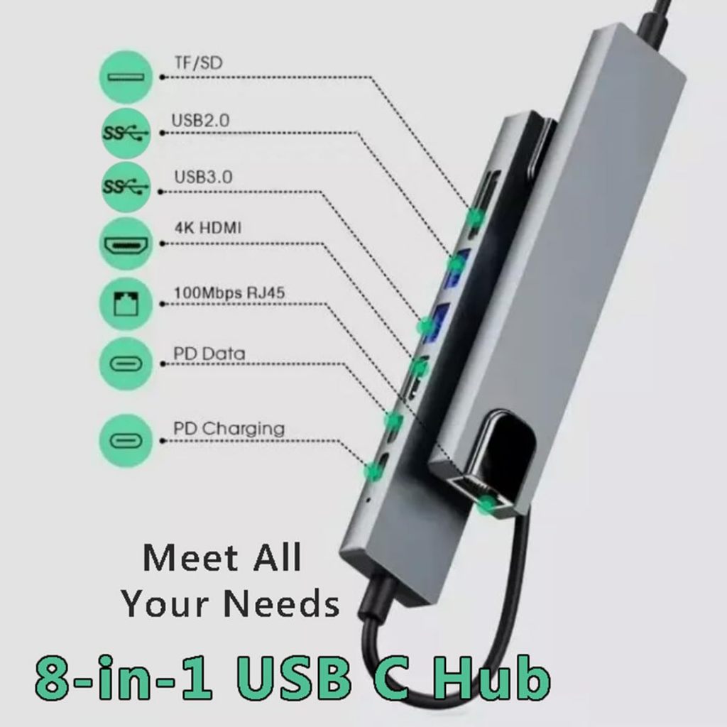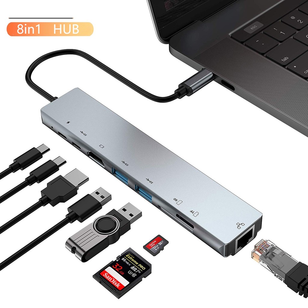 Docking Station 8 in 1 Type C USB Hub untuk MacBook, Dilengkapi Card Reader, HDMI 4K, dan Port SD