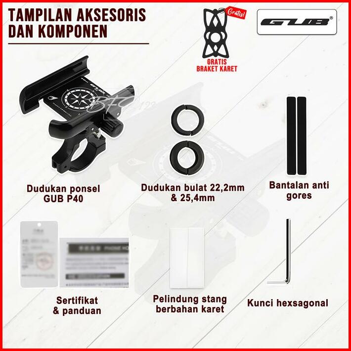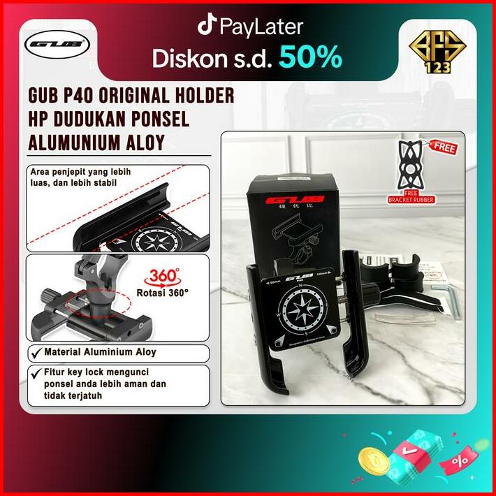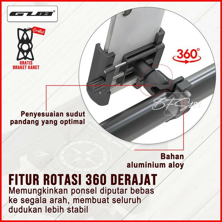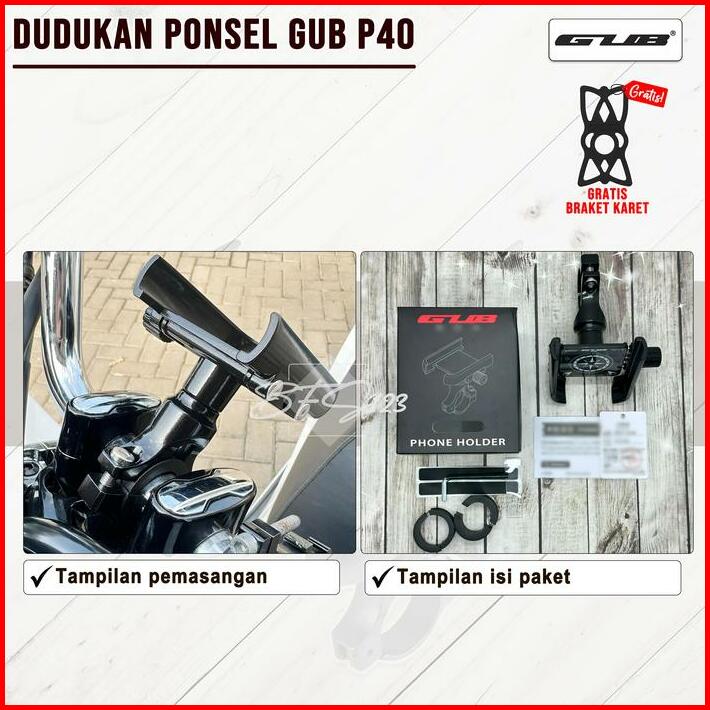 Gub P40 Holder Hp Handphone Motor Aluminium Aloy Dudukan Ponsel 360 Rotate Rubber Hitam