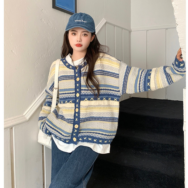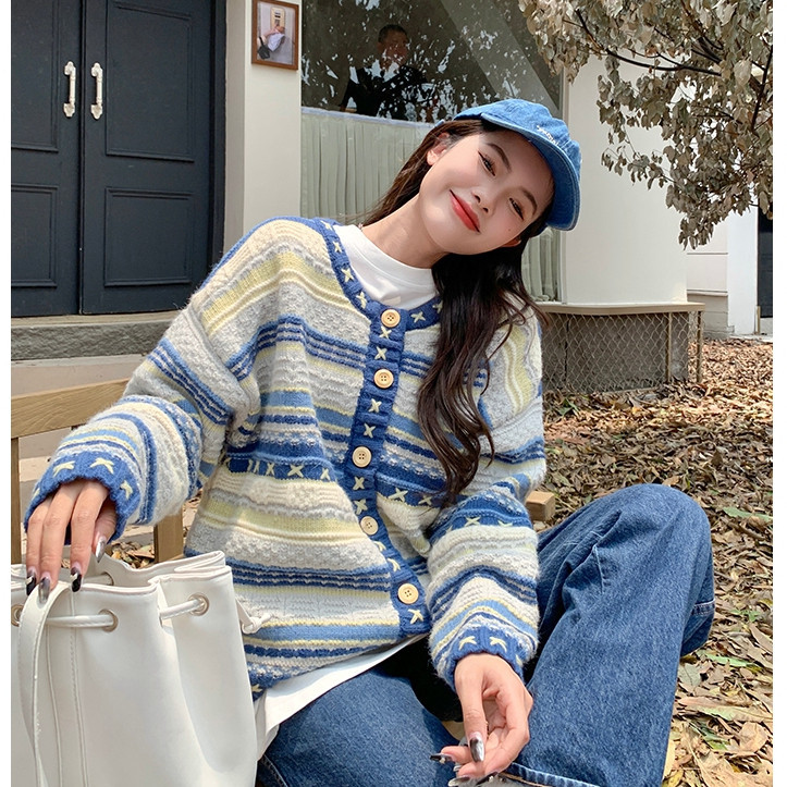 SHENNING Cardigan Rajut Premium Outer Knit Terbaru Sweater Stripe Wanita Motif Stripe Biru
