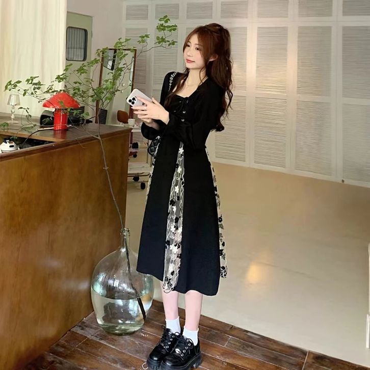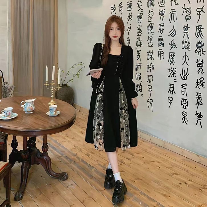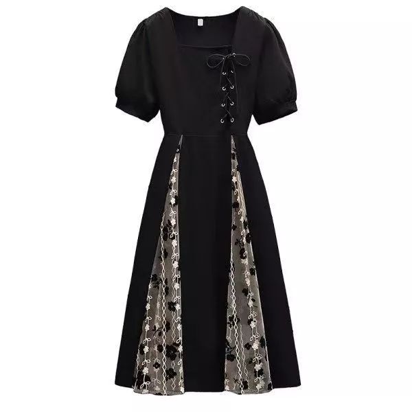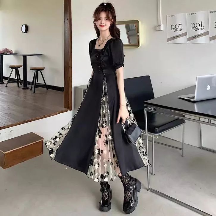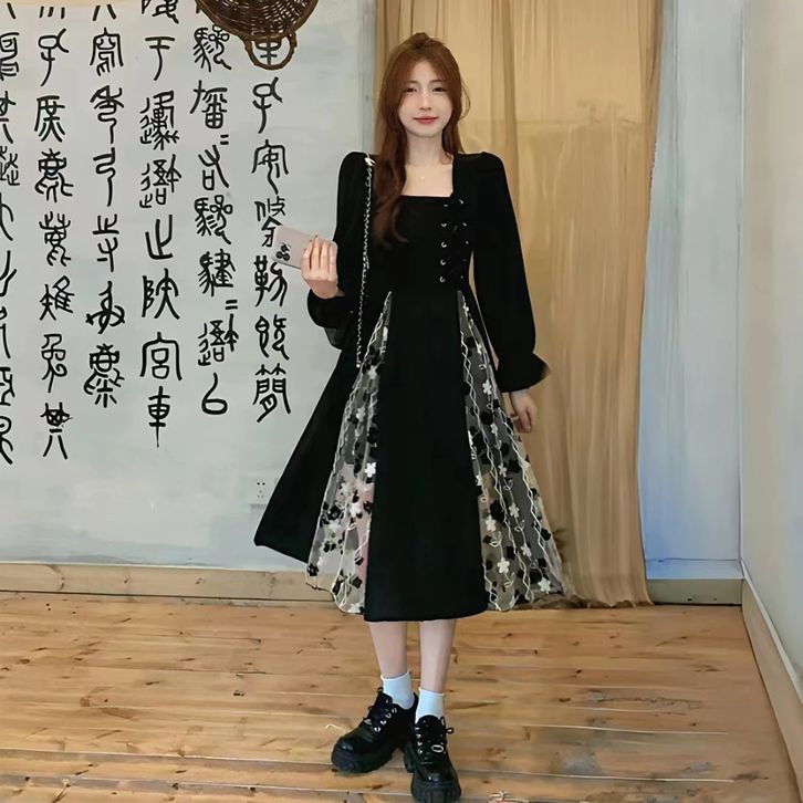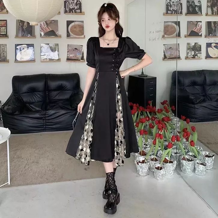 black dress korea ukuran besar jumbo square neck retro vintage jahitan tile dress hitam dess wanita korea kekinian