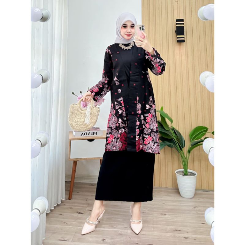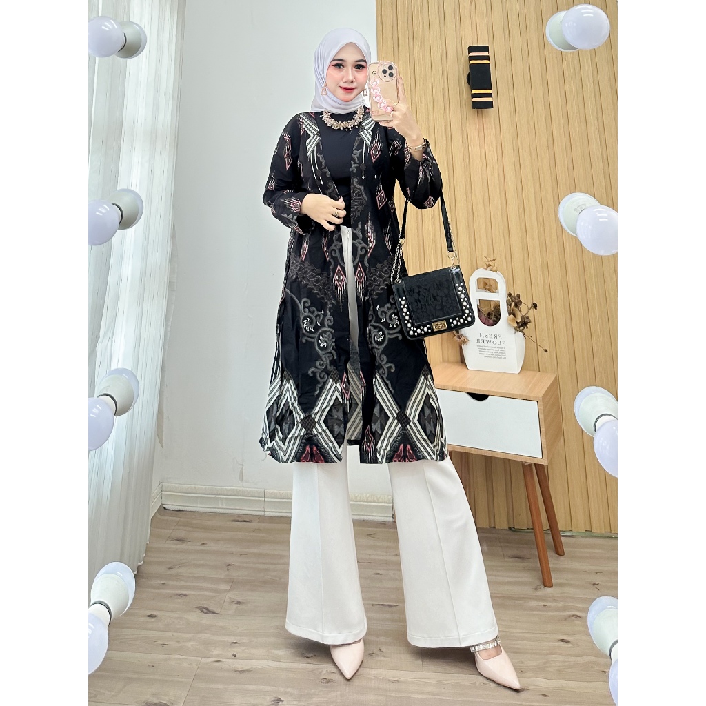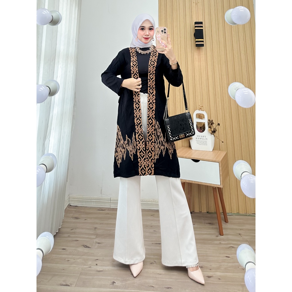 Long Cardi Batik Motif Modern Kekinian Simple Fashion Long Cardi Outer Panjang Tanpa Lengan Resleting Depan Outerwear Cardigan Rompi Panjang