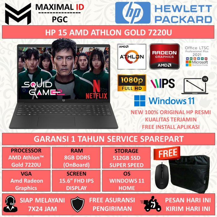 Laptop Baru HP 15 Amd Athlon Gold 7220U 8GB DDR5 1TB SSD 15.6 Inch HD Win 11 Home
