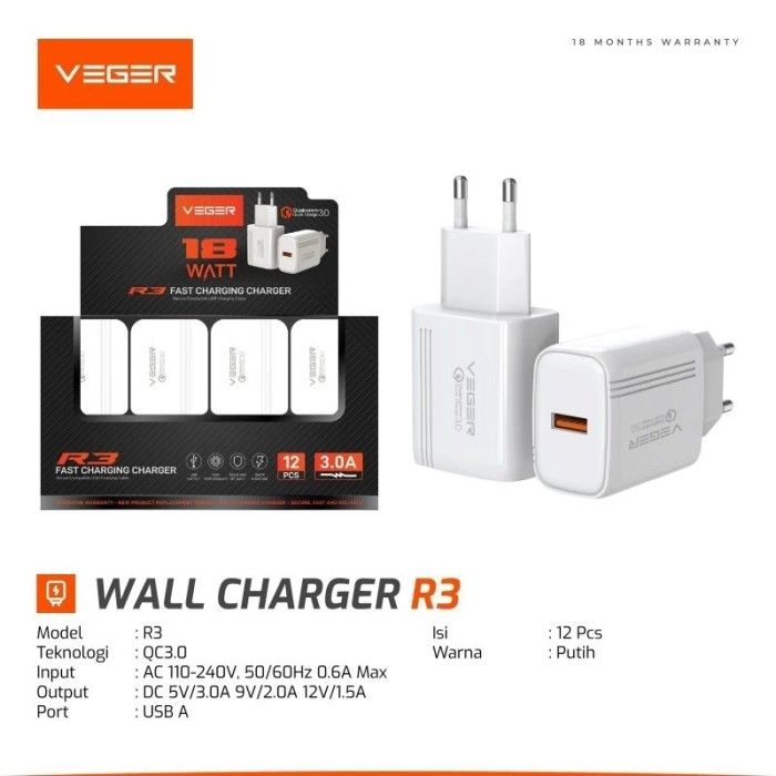 VEGER R3 / Batok Adapter Charger Veger R3 18w Quick Charge 3.0 fast