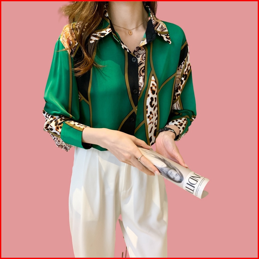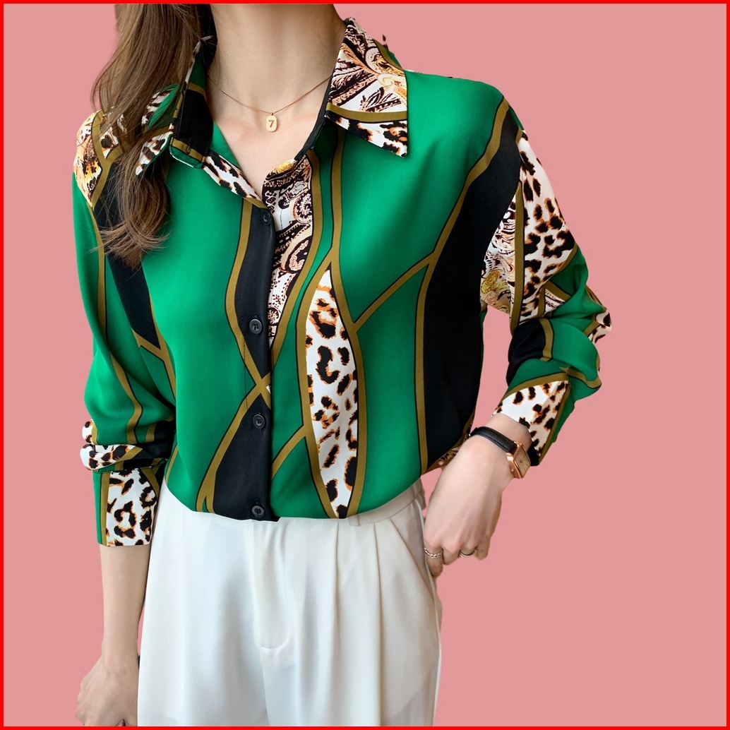 New Fashion Korean Style High Quality Fabric Green Geometric Pattern Chiffon Women Long Sleeve Shirt Ol Office Casual Lo