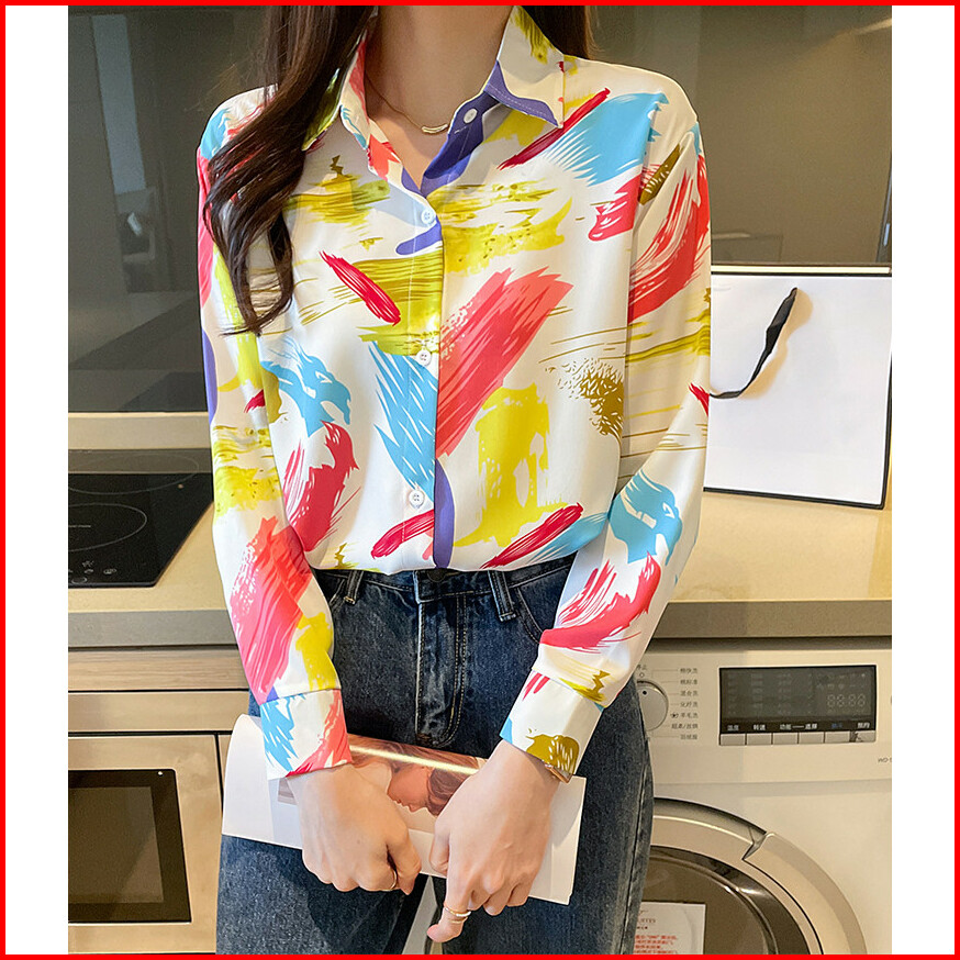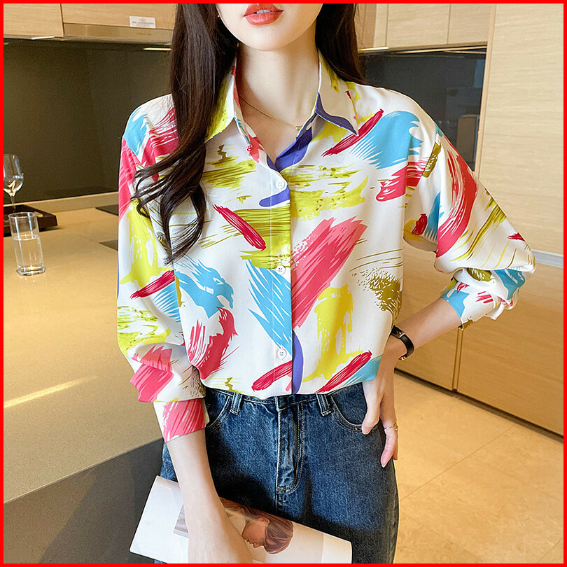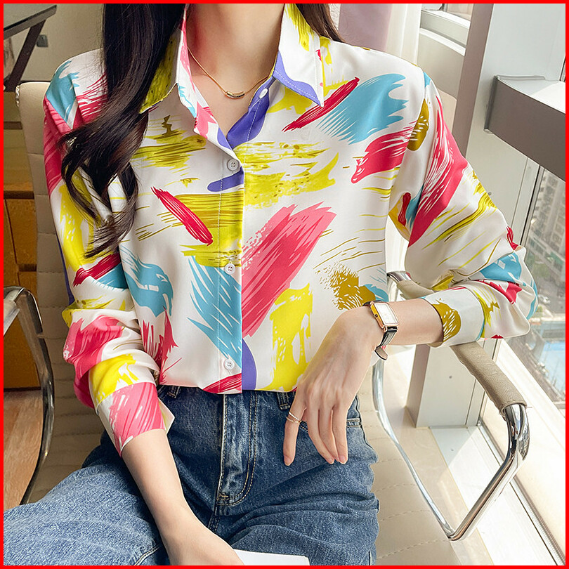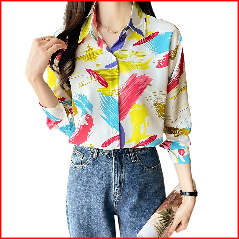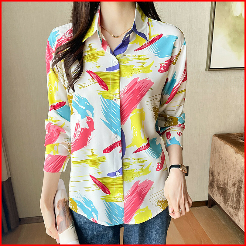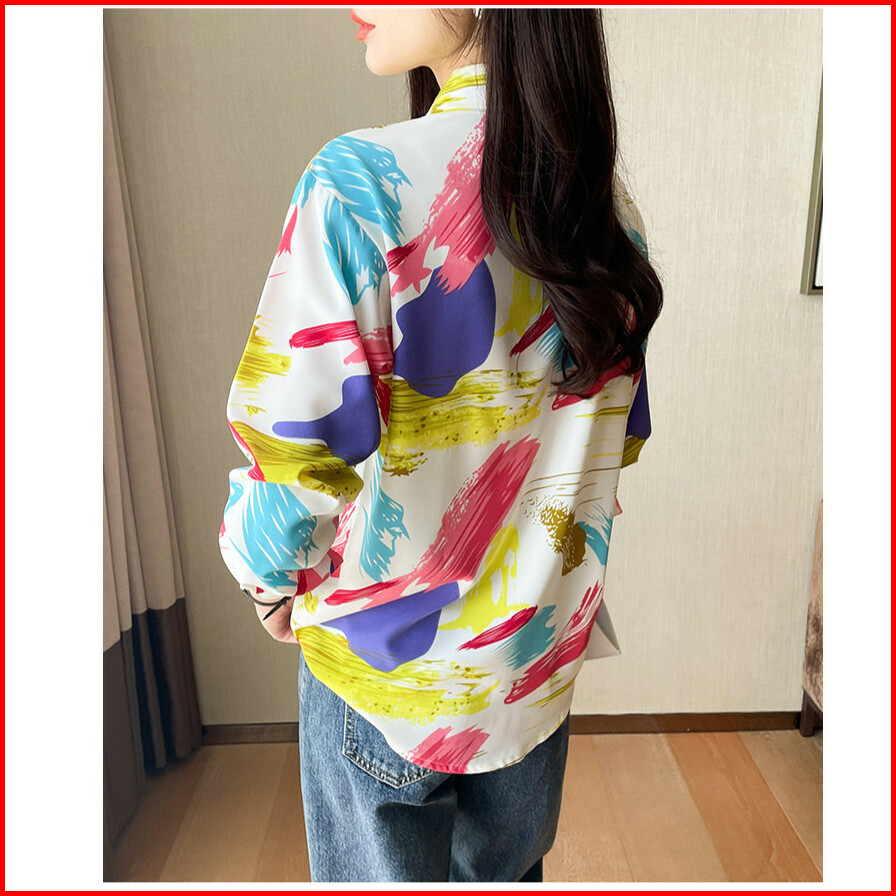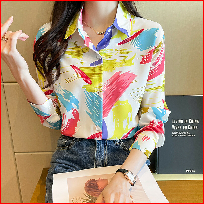 Newba High Quality Chiffon Fabric Fashion Korean Style Long Sleeve Shirt Color Printing Loose Casual Travel Job Street W