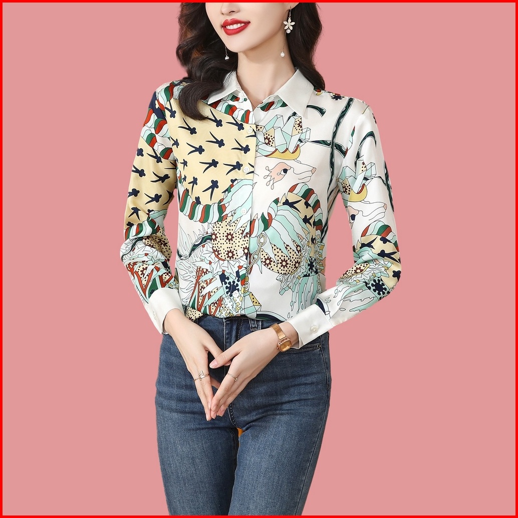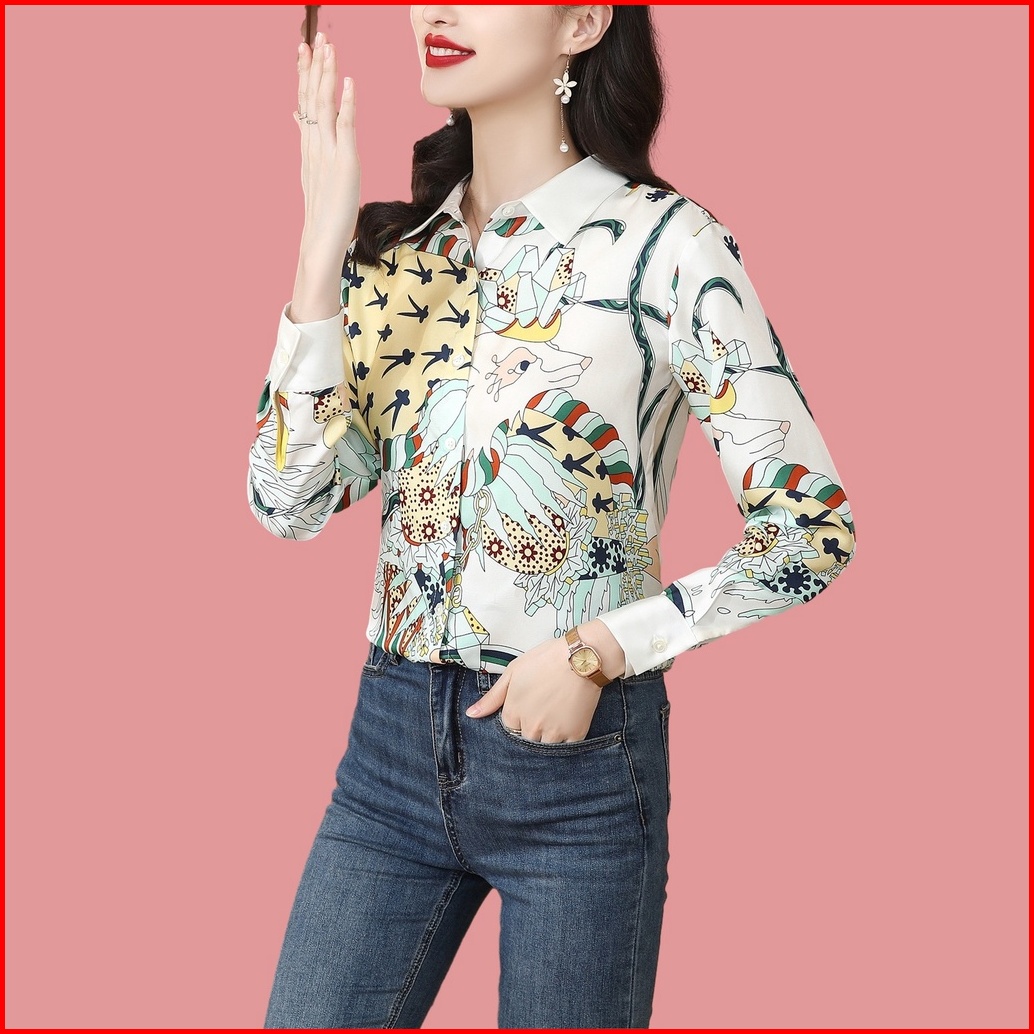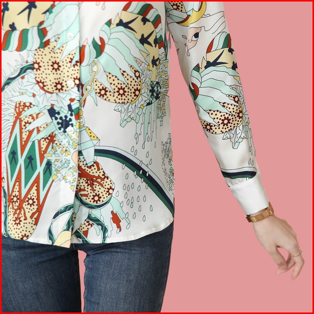 New Fashion Korean Style Rayon Satin Soft Smooth Fabric Digital Printing White Long Sleeve Office Casual Women Shirts