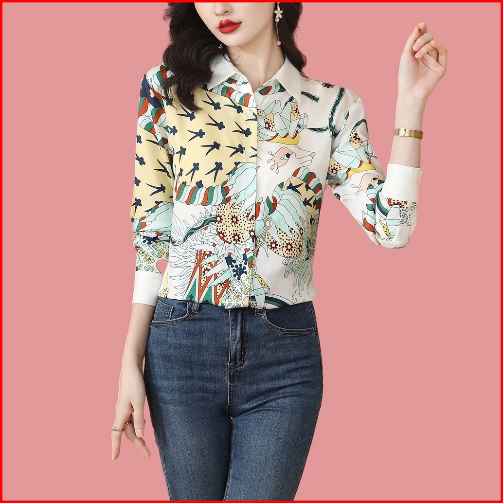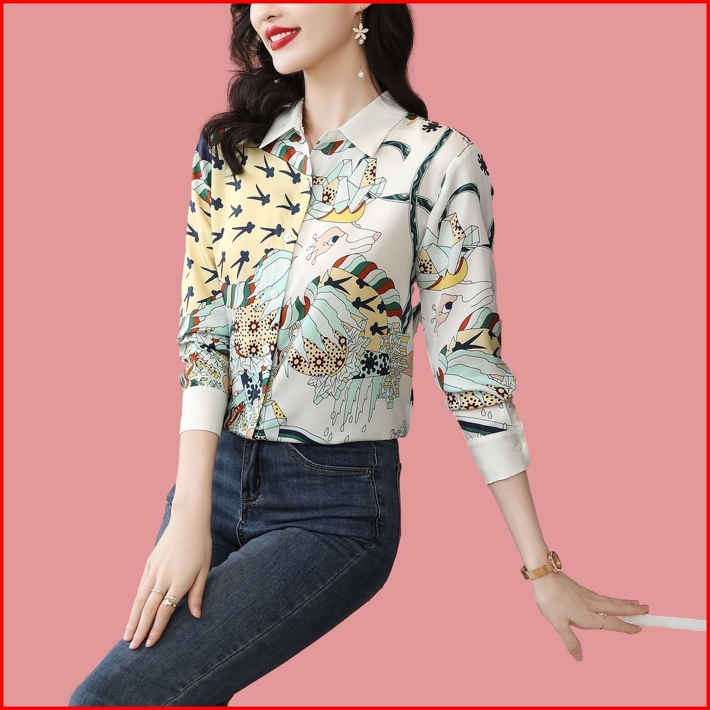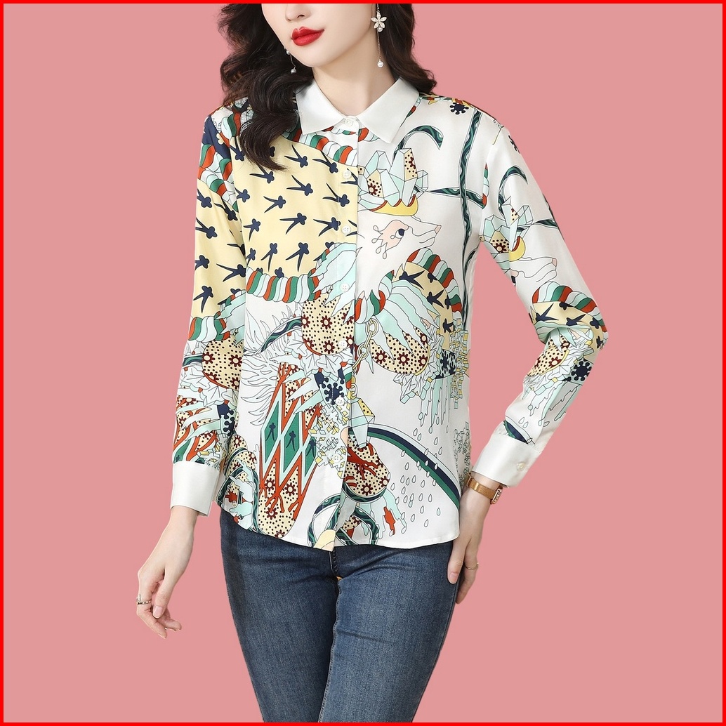 New Fashion Korean Style Rayon Satin Soft Smooth Fabric Digital Printing White Long Sleeve Office Casual Women Shirts