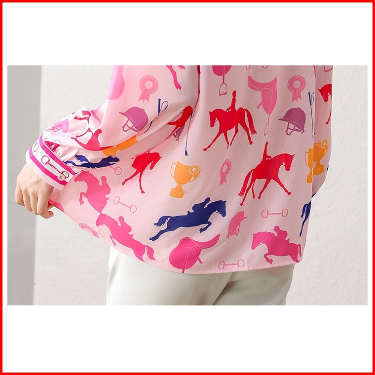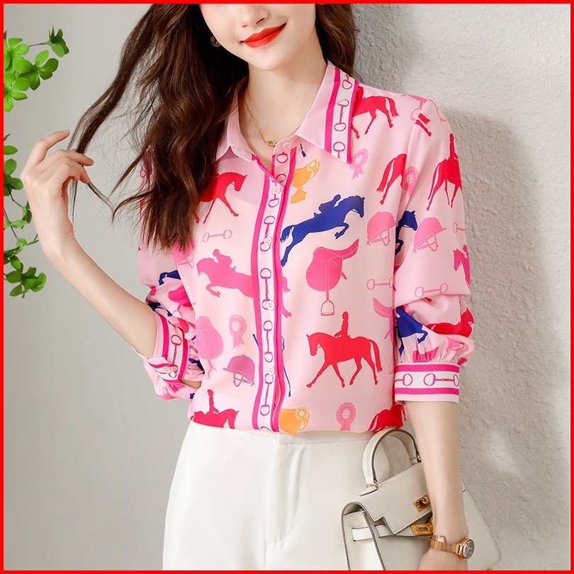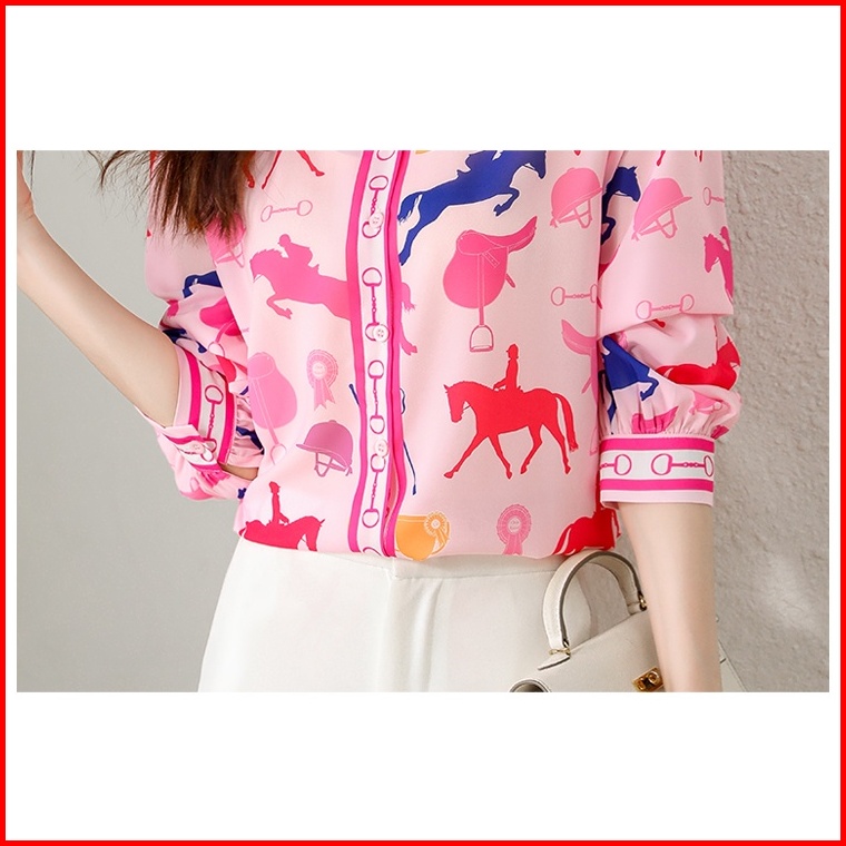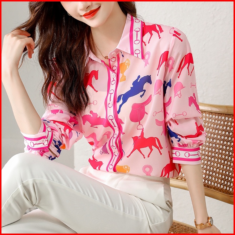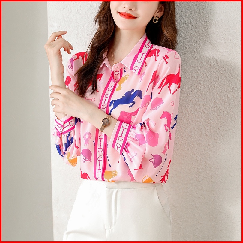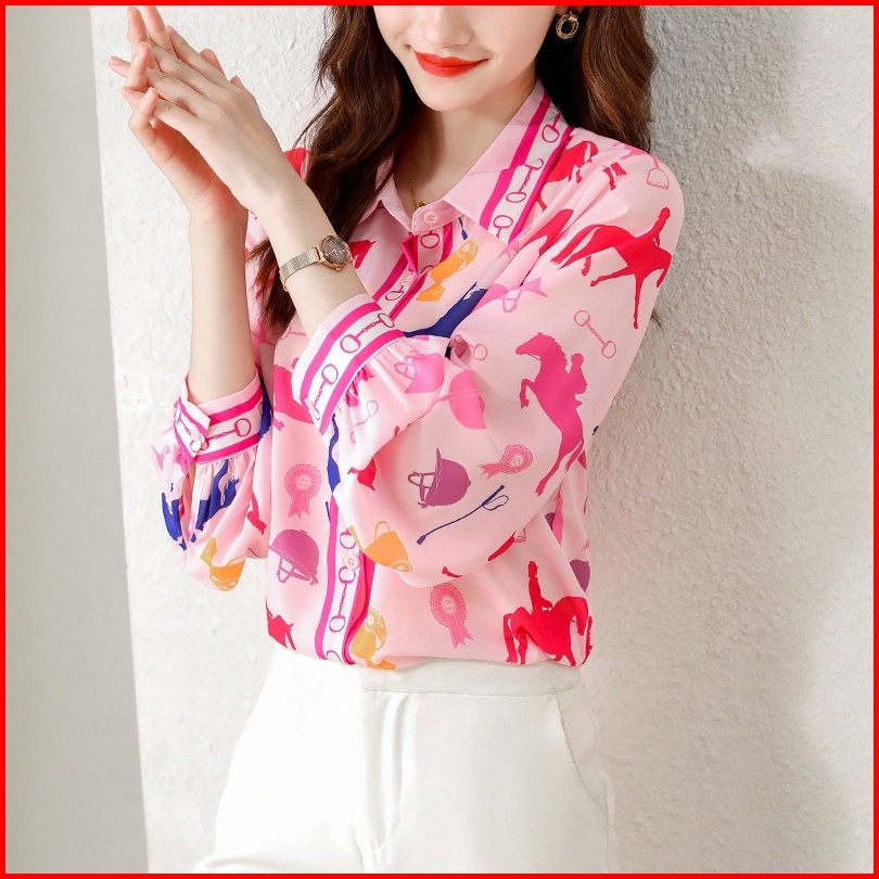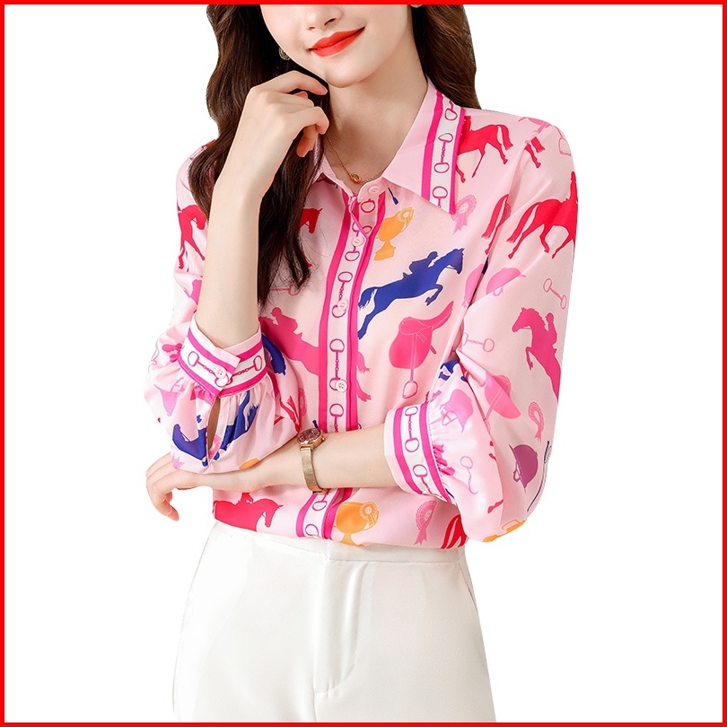 Kain Berkualitas Tinggi Tidak Akan Pudar Kemeja Sablon Merah Muda Kasual Bekerja Kemeja Lengan Panjang Wanita Fashion Ko
