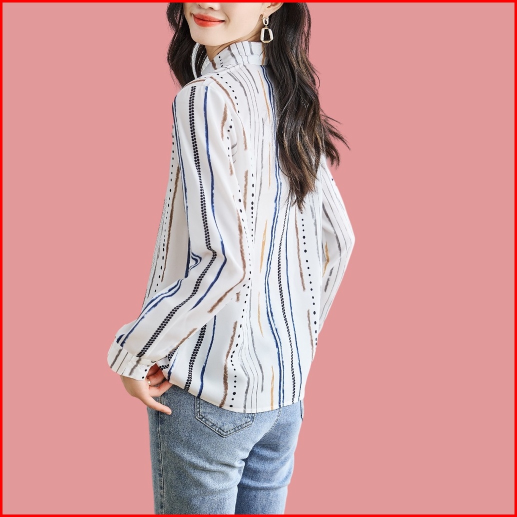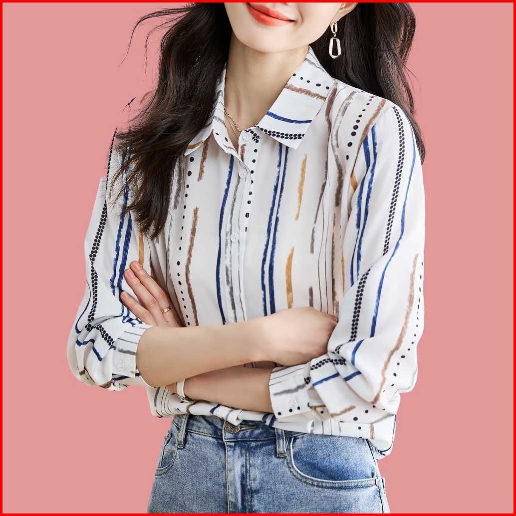 New.fashions Kain Sifon Berkualitas Tinggi Kemeja Wanita Lengan Panjang Bergaris Putih Atasan Import Longgar Ala Korea