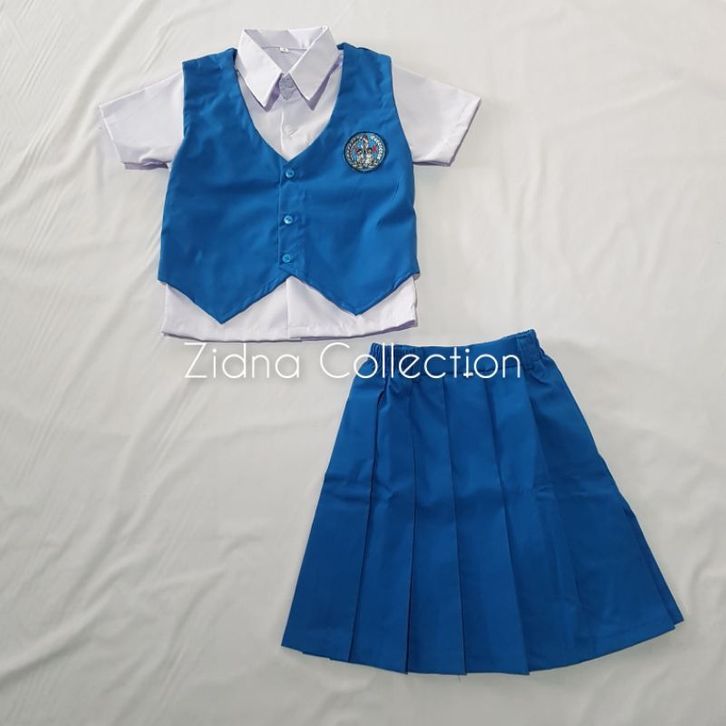 Setelan Biru Putih Rompi Pendek Celana Rok Dress Seragam Sekolah Playgroup TK