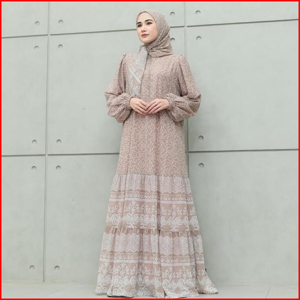Aisyalina Id Sabella Set Series 62 Series 63 Pashmina Segiempat Bahan Ceruti Motif Printing Dress Gamis Wanita Motif Tan