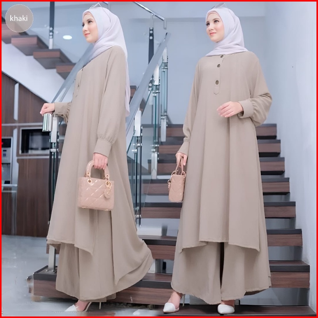 Vallina Outfit - Aira Set 2in1 Setelan Muslim Wanita Celana Polos Lebaran Kondangan Premium Crinkle Jumbo M - Xl