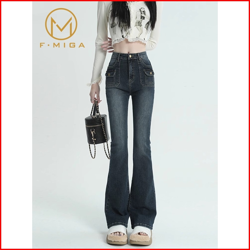 F Miga C106 High Waist Cutbray Flare Celana Jeans Panjang Wanita - Biru Retro