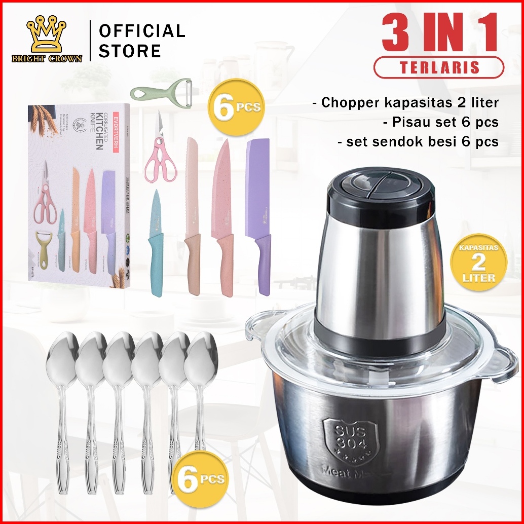 Bright Crown Promo Combo Terlaris Chopper Elektrik 2l Pisau 6in1 Sendok Garpu Stainless 6pcs