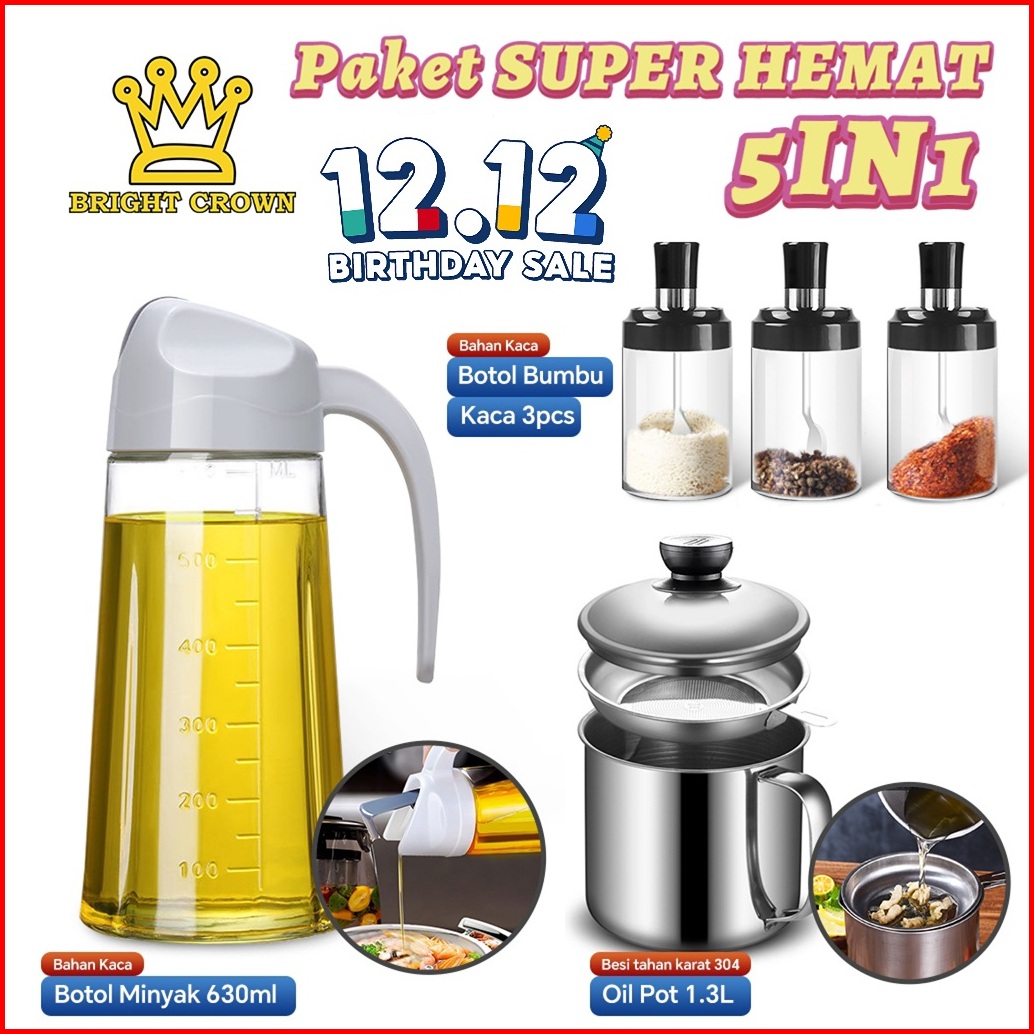 Bright Crown Paket Super Hemat 5in1 Botol Minyak Kaca 630ml Oil Pot 1 3l Tempat Bumbu Botol Kaca
