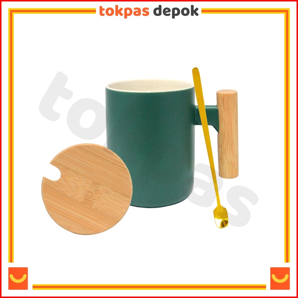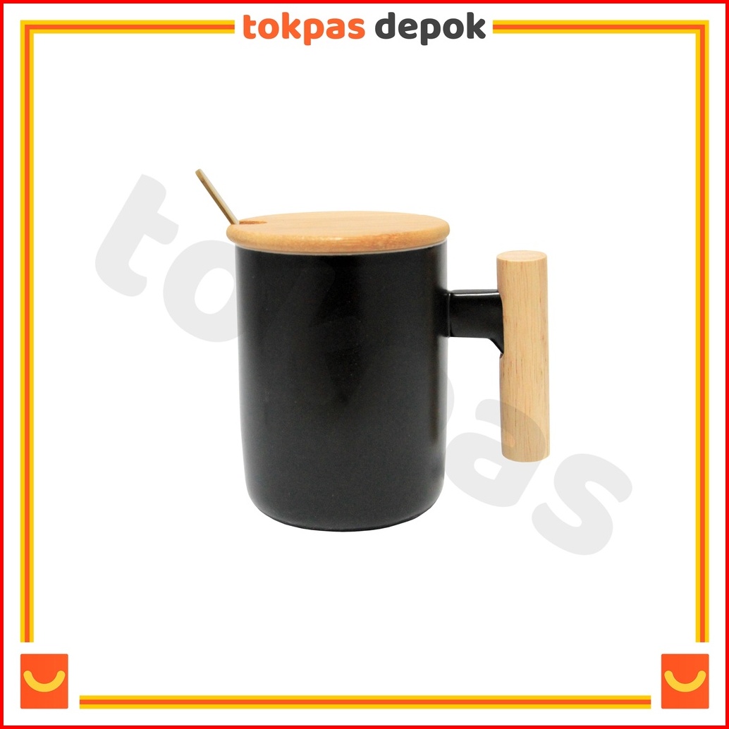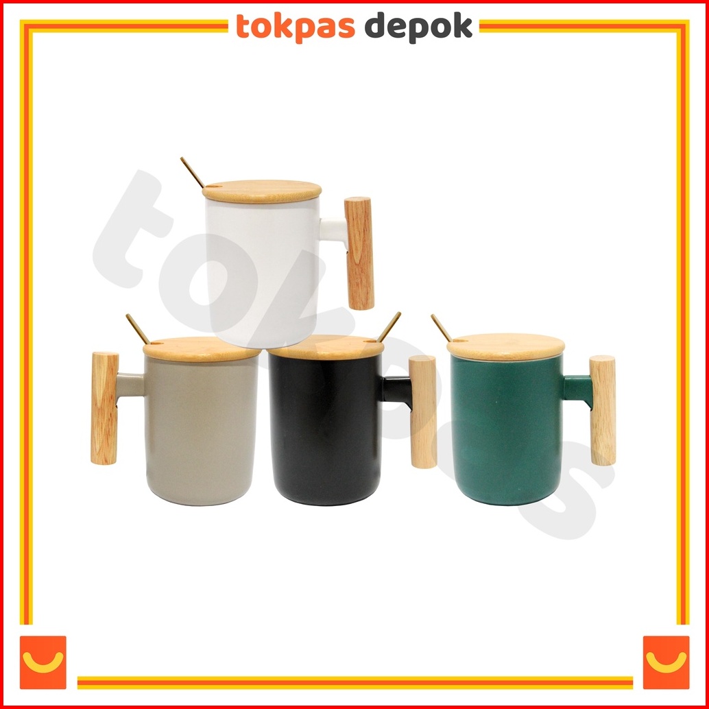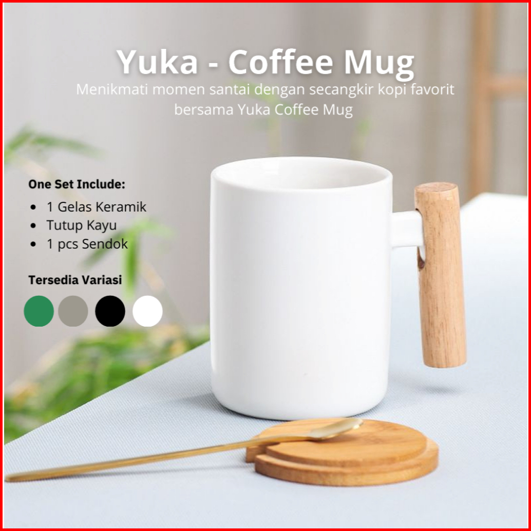 Mug Gagang Kayu Cangkir Teh Kopi Keramik Minimalis Yuka Dengan Tutup Dan Sendok Im-066