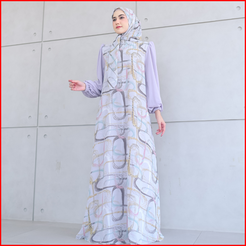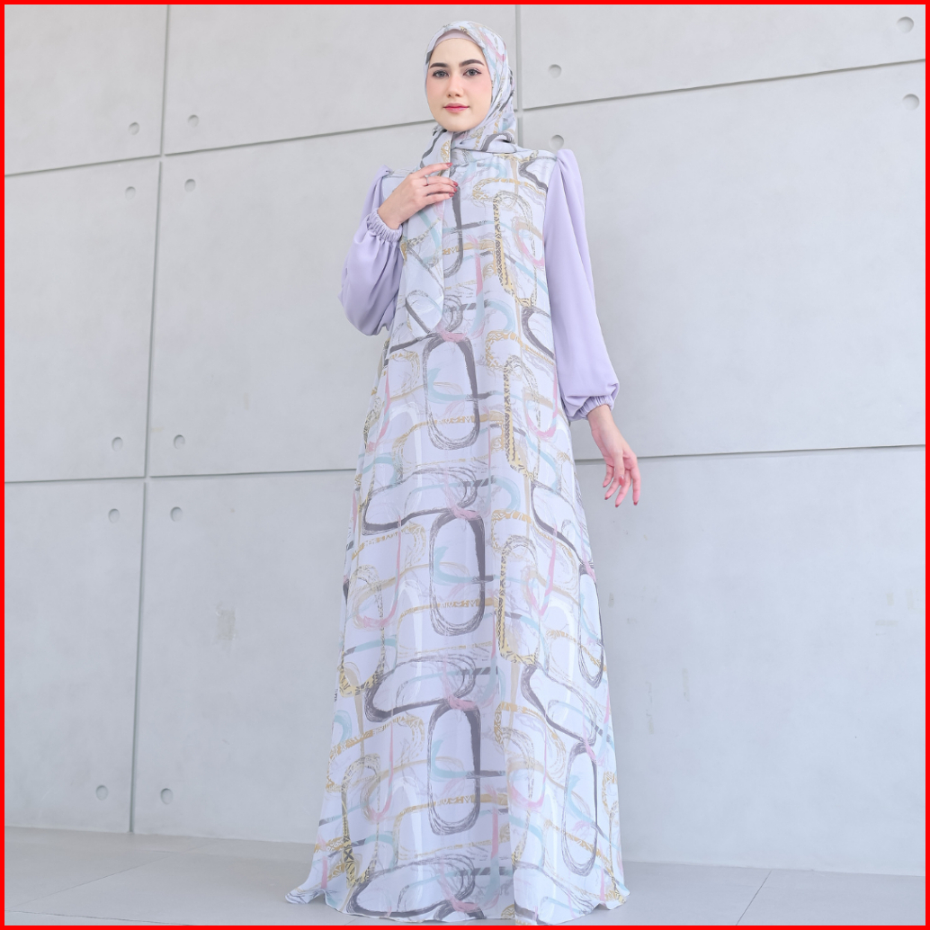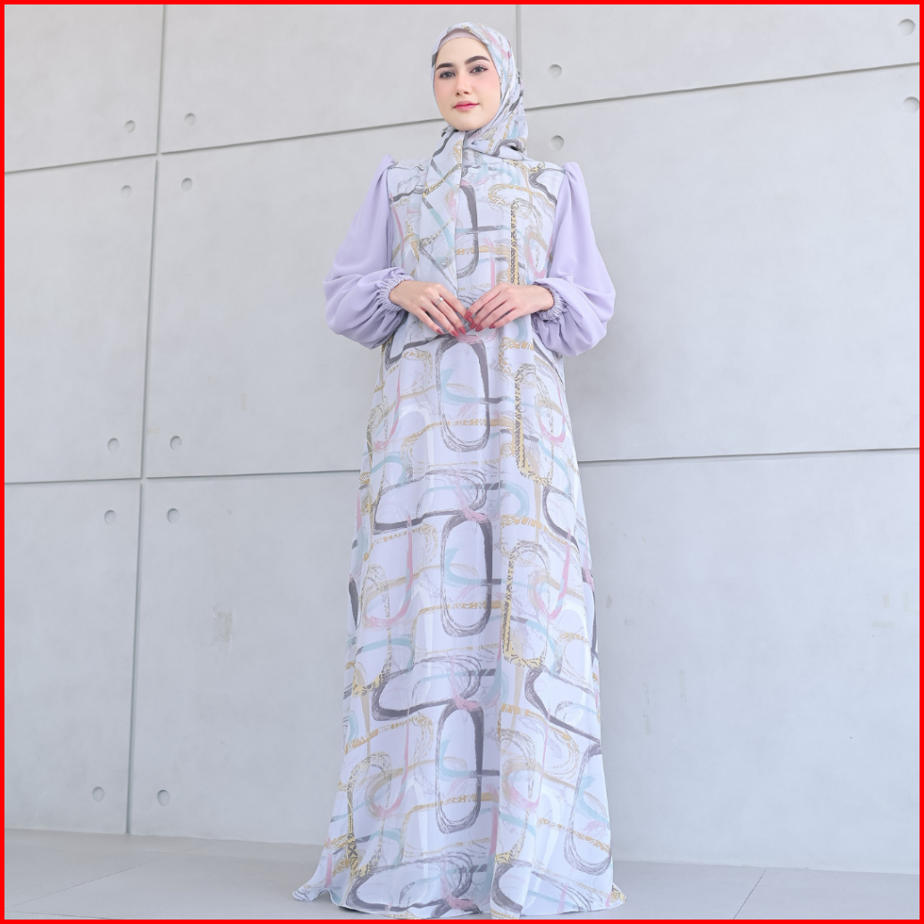 Aisyalina Id Naisha Set Series 29 Pashmina Segiempat Bahan Ceruti Motif Printing Full Furing Gamis Wanita Elegan Tangan