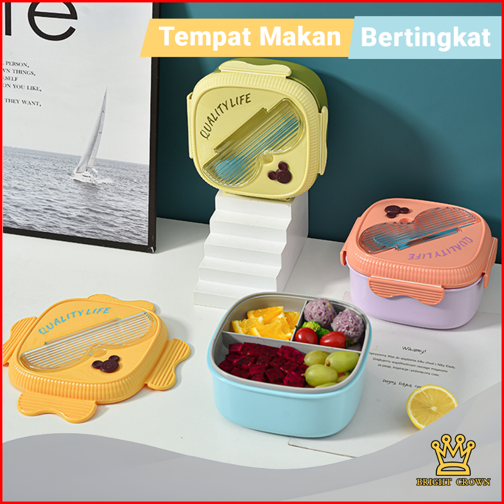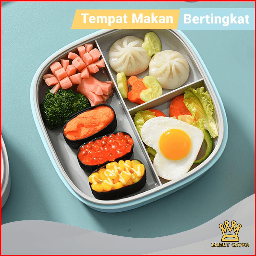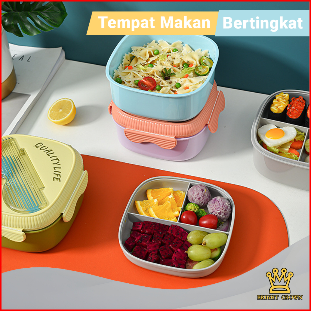 Bright Crown Lunch Box Kotak Makan 2 Tingkat 3 Sekat Holder Hp Bpa Free Anti Tumpah Free Sendok