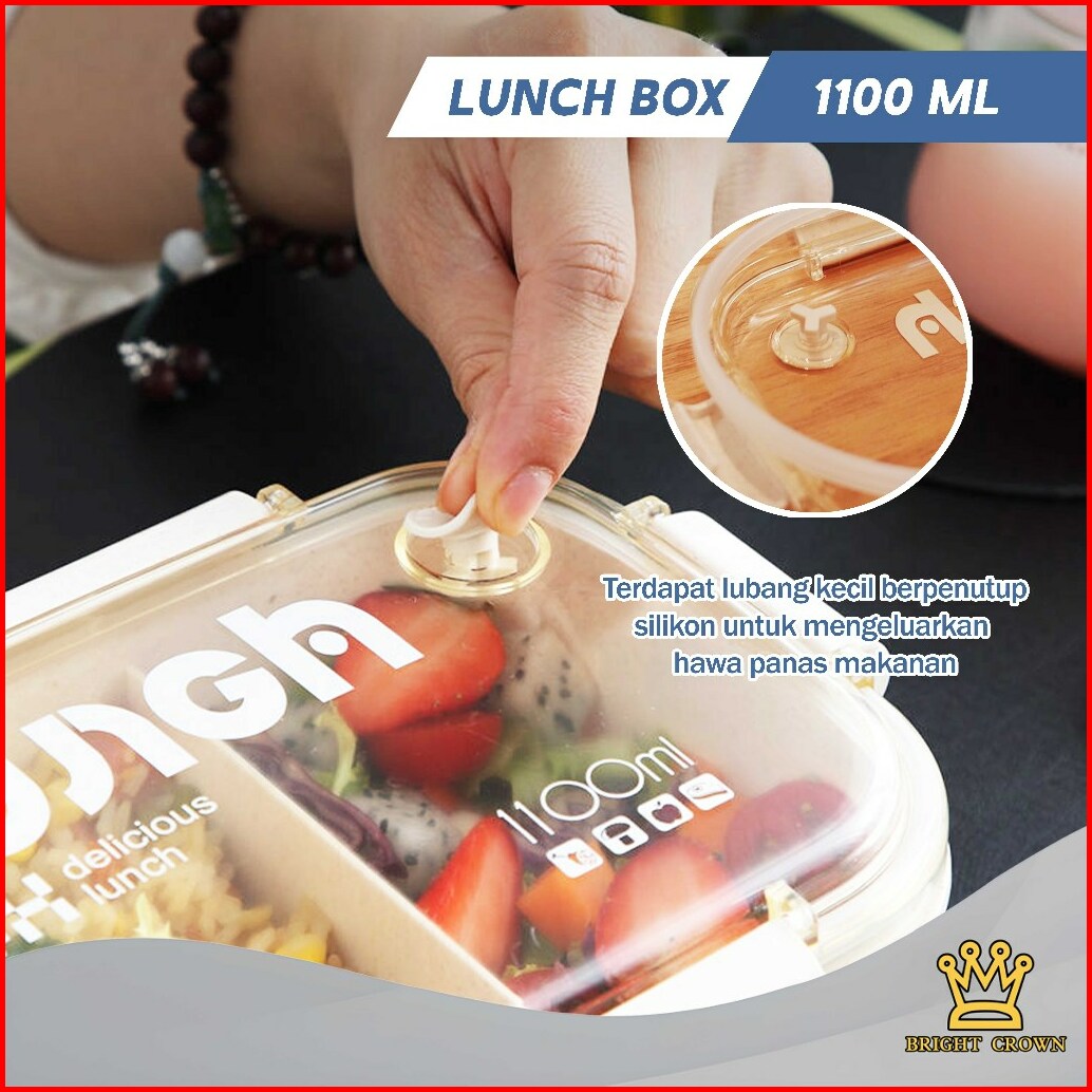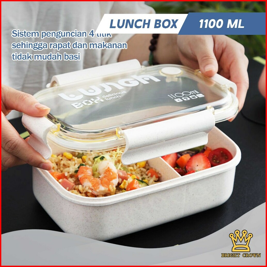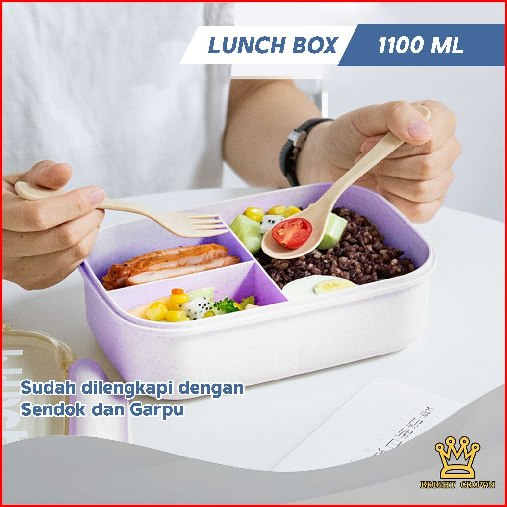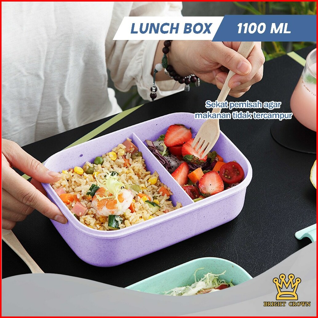 Bright Crown Lunch Box Set 1100ml Kotak Bekal Makan 2 Sekat Free Sendok Garpu Jerami Gandum Tempat Bekal Makan Anti Tump