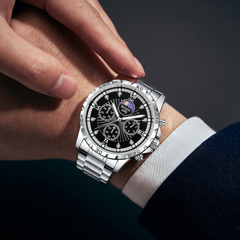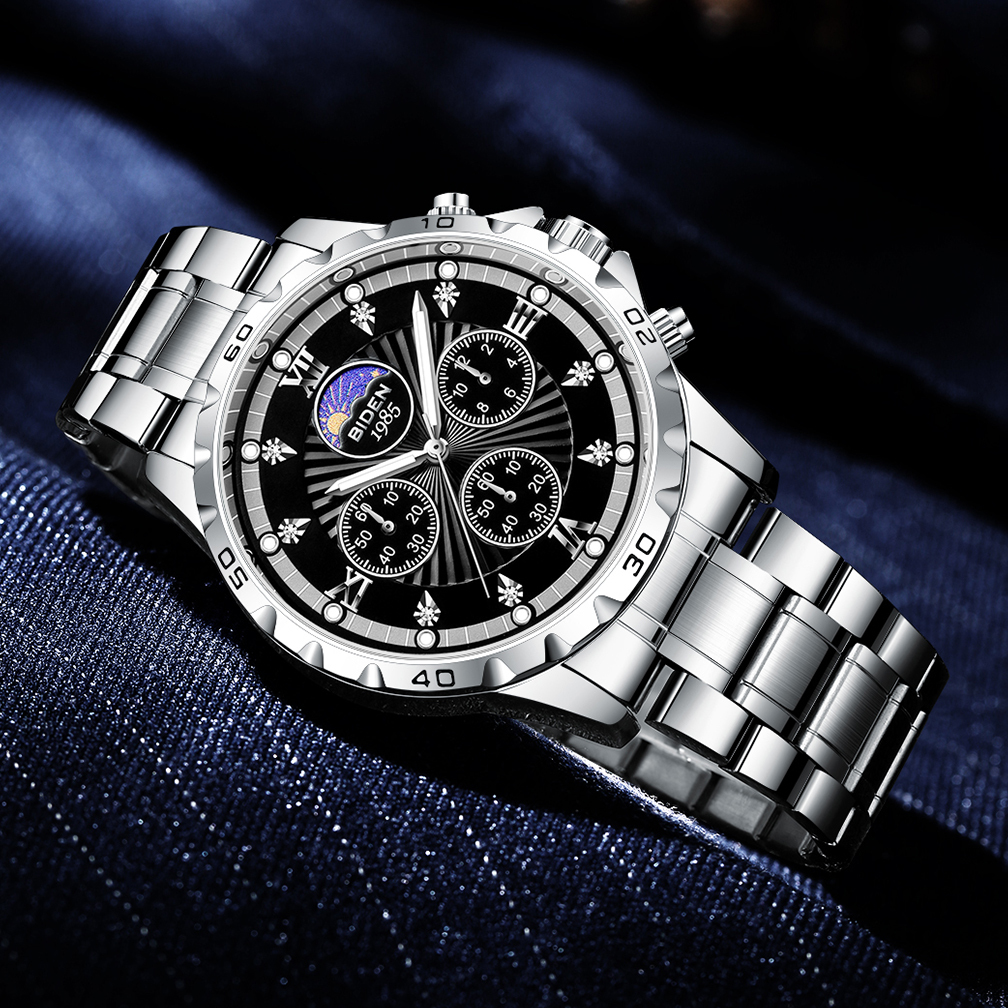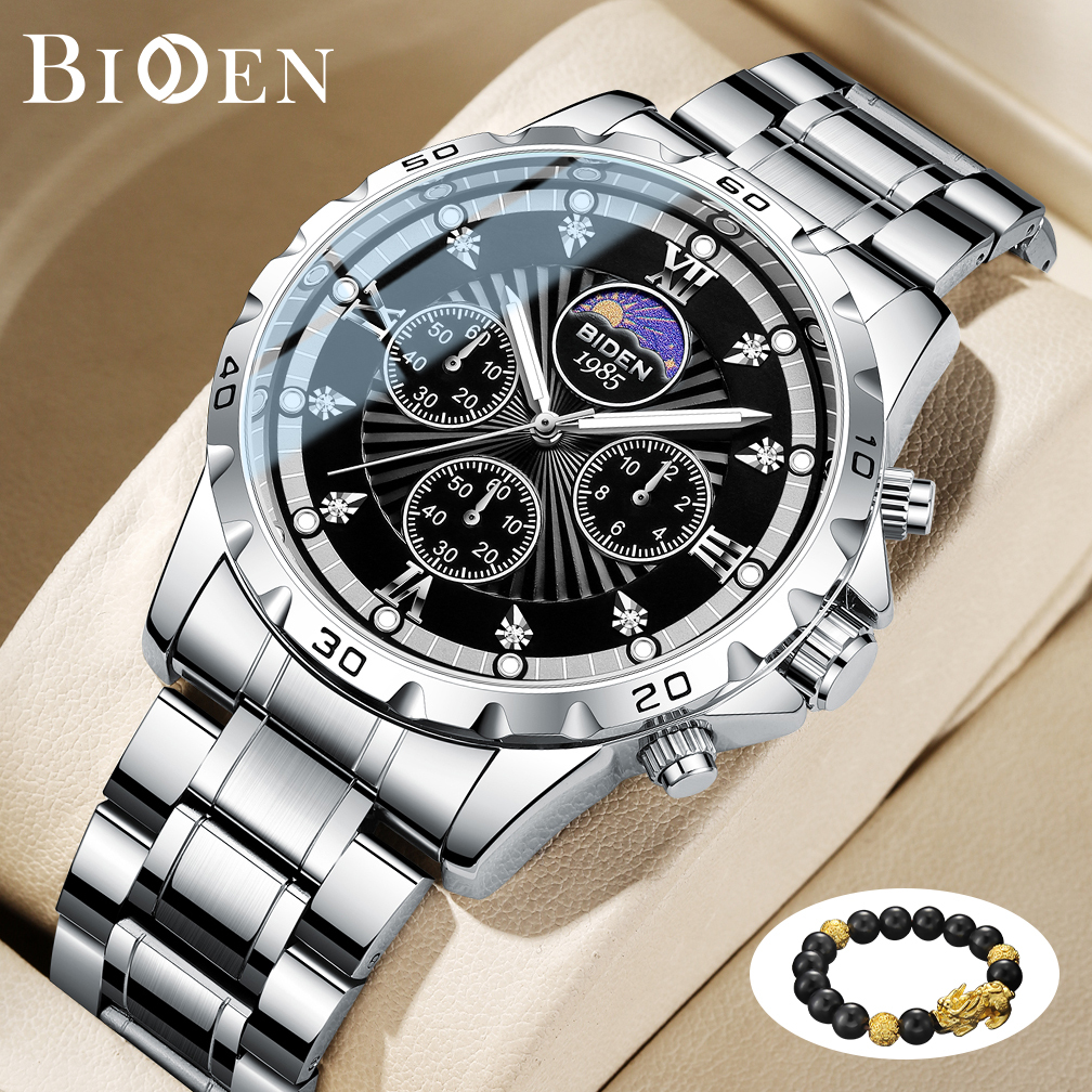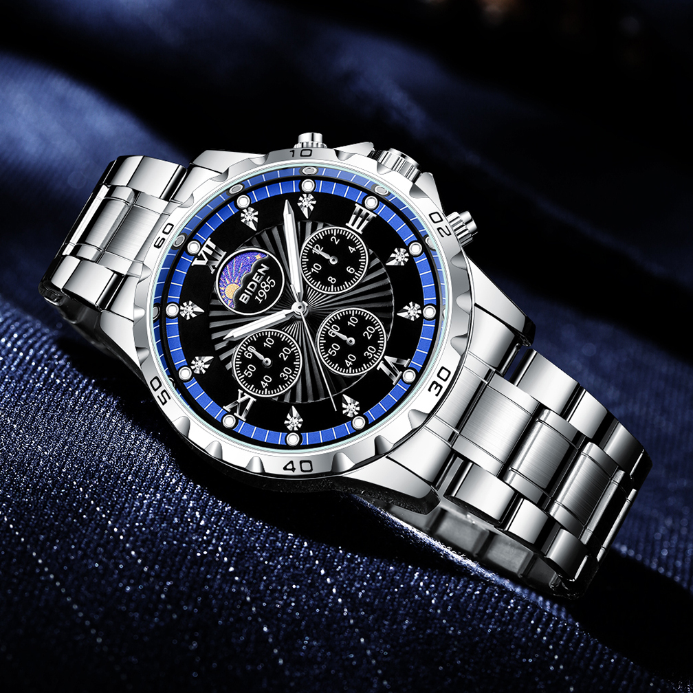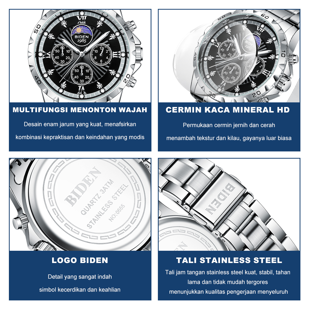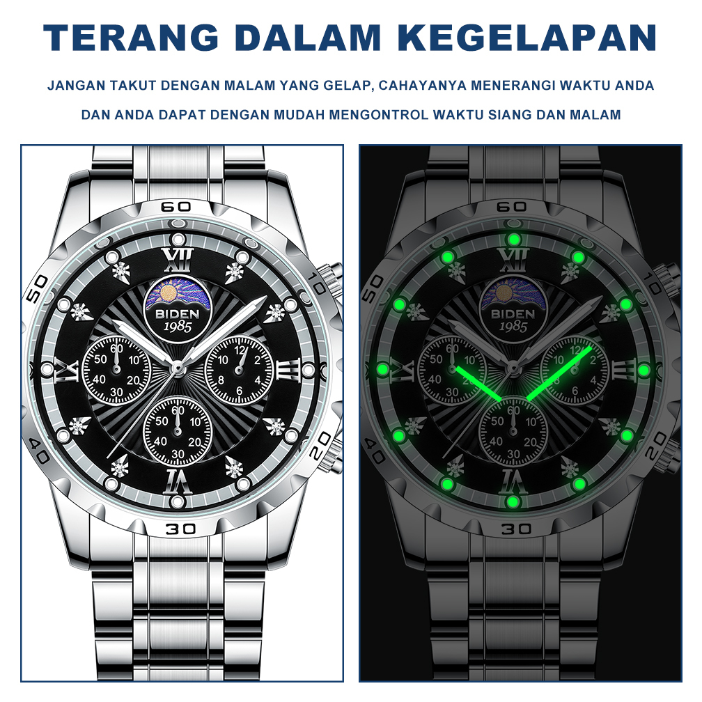 Jam Tangan Pria BIDEN Anti Air Olahraga Kronograf Bercahaya Tali Stainless Steel Original