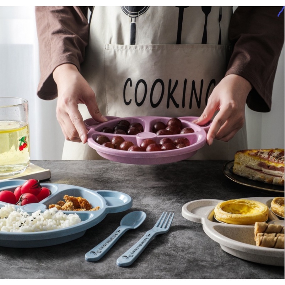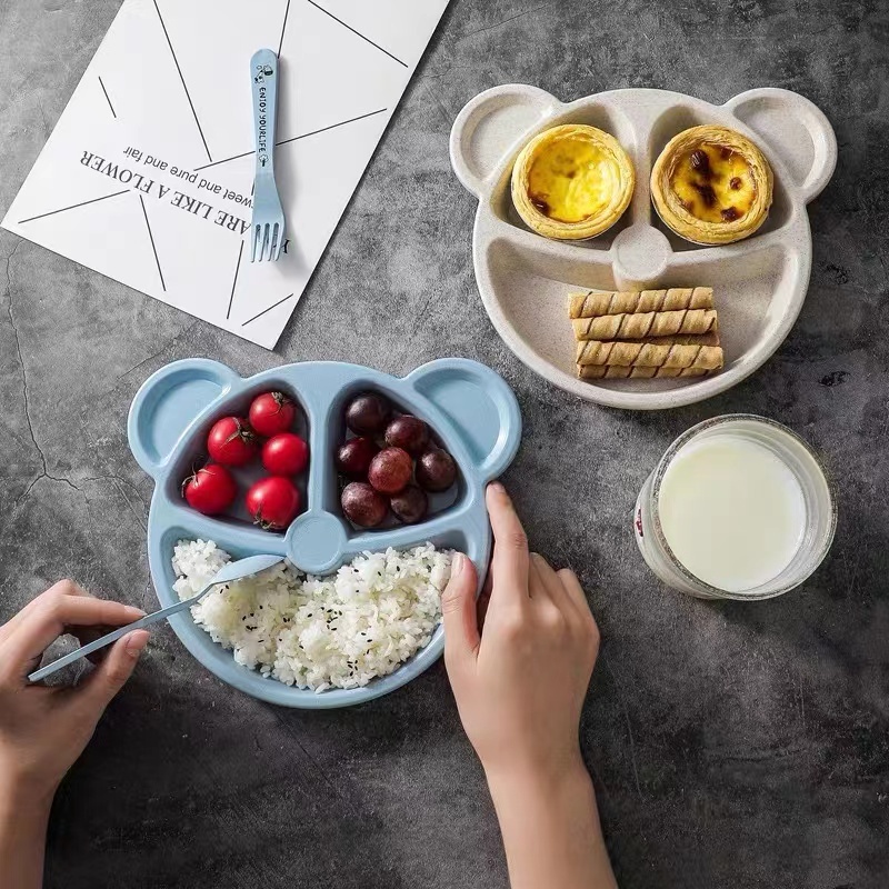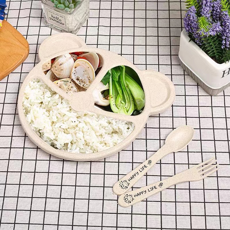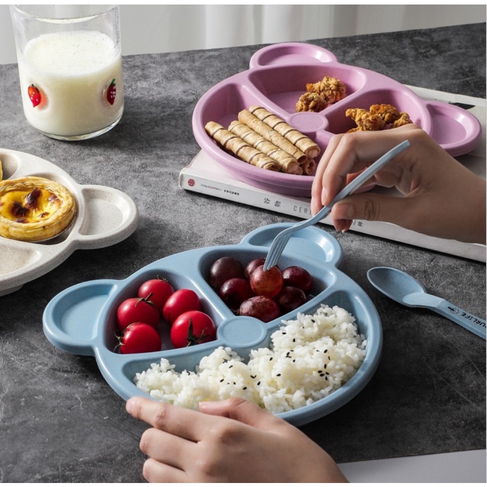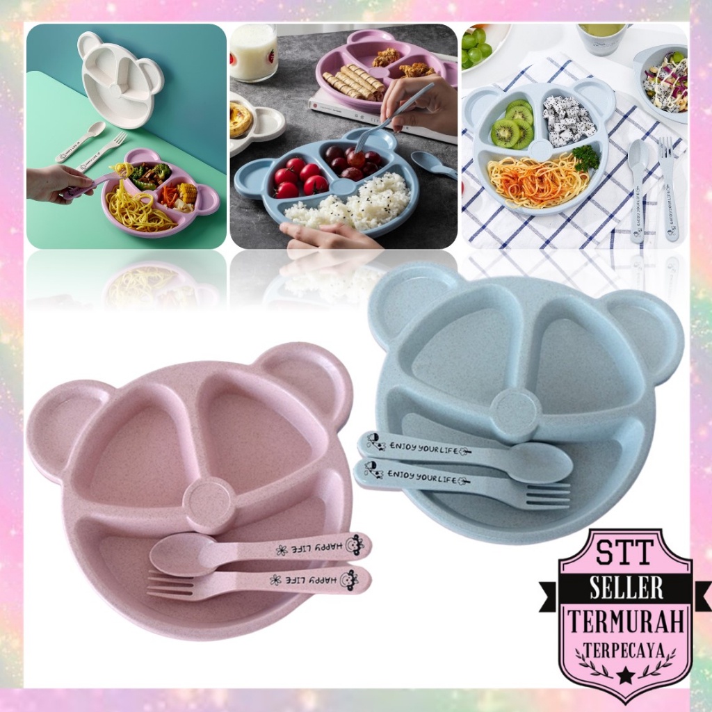 STT Peralatan Makan Anak Set 3-Piece Bentuk Bear Tempat Makan Bayi Bahan Jerami Baby Feeding Set Cartoon Tablewar