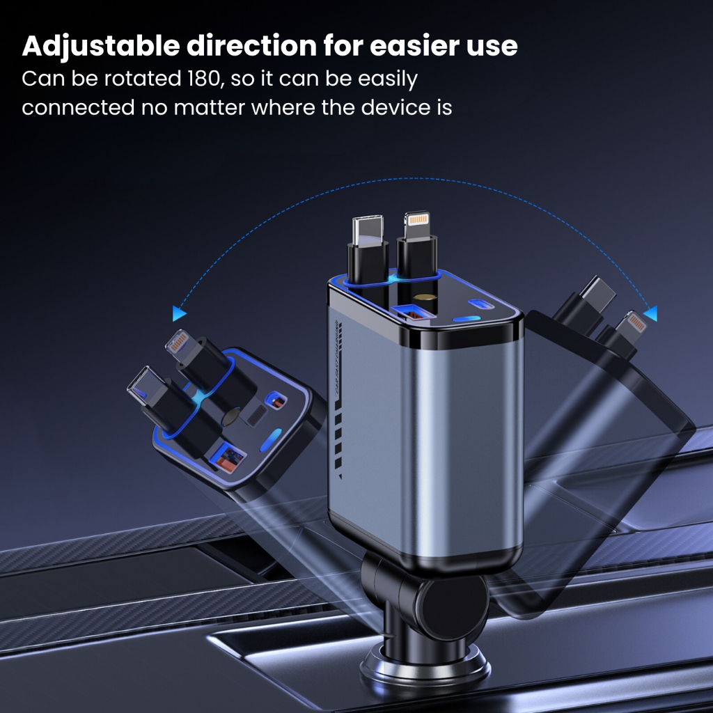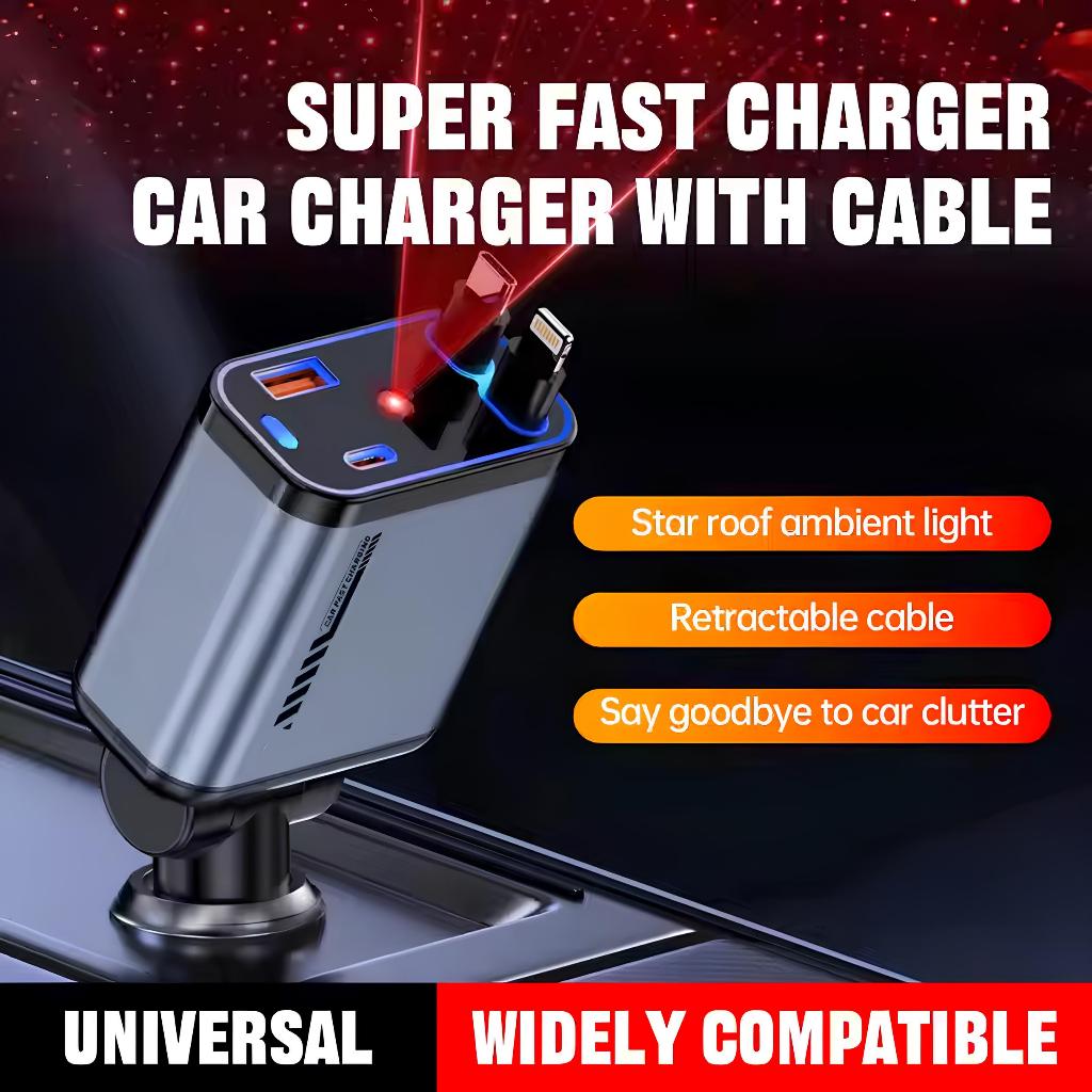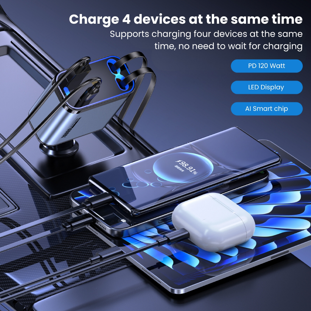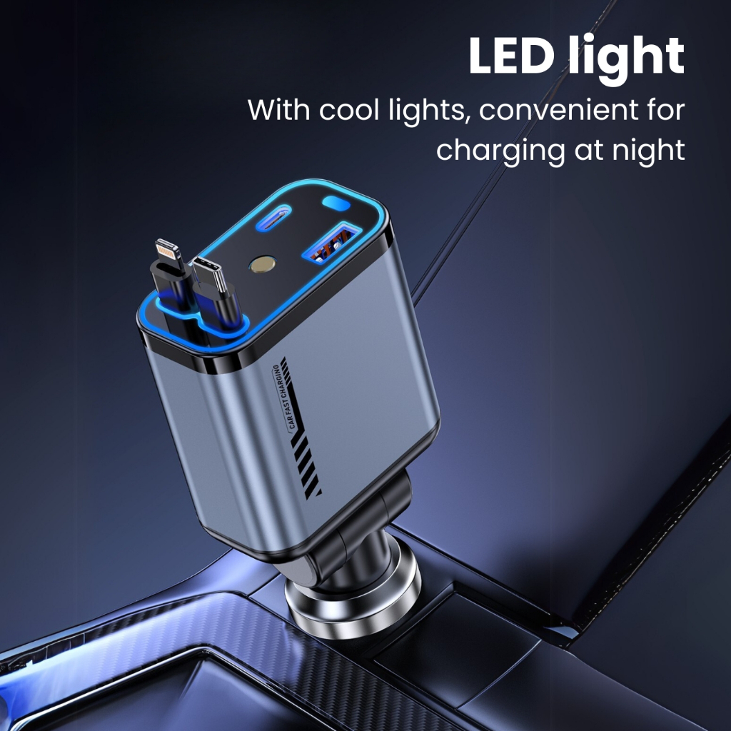( PROMO )UPLU 4 In 1 Car Charger Retractable LED PD 120W Fast Charging Colokan Mobil Motor Type C & Lightning
