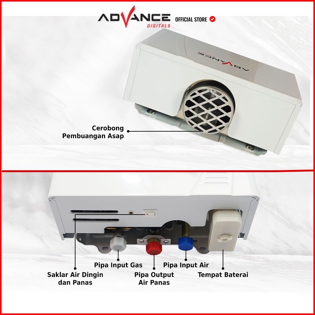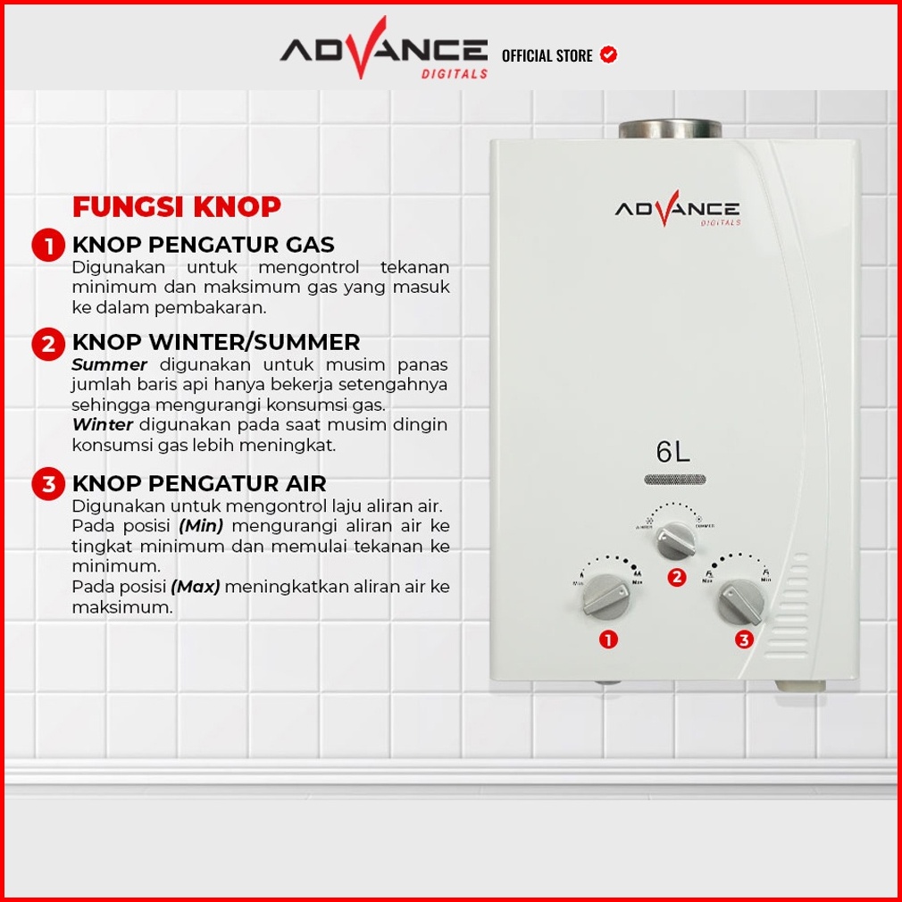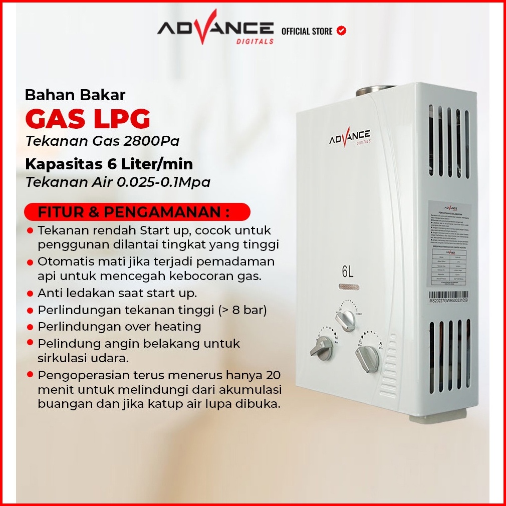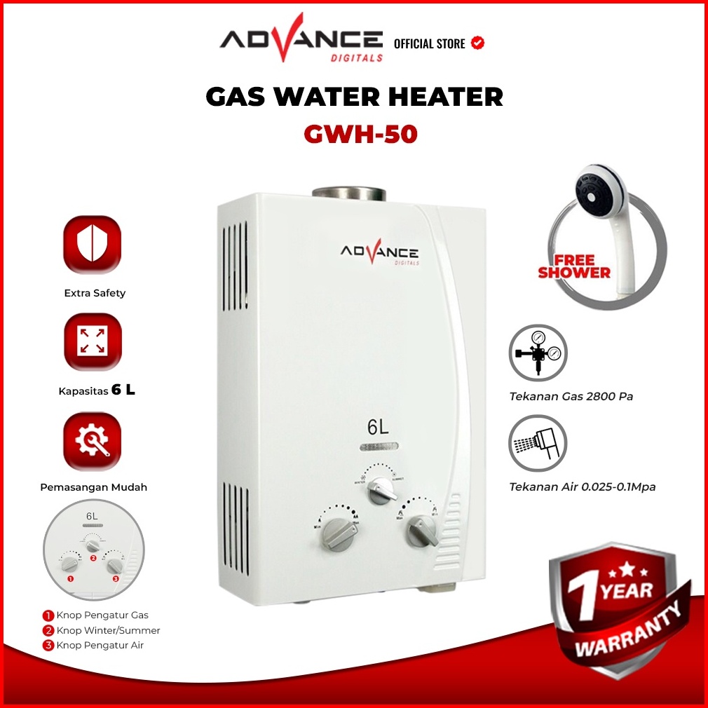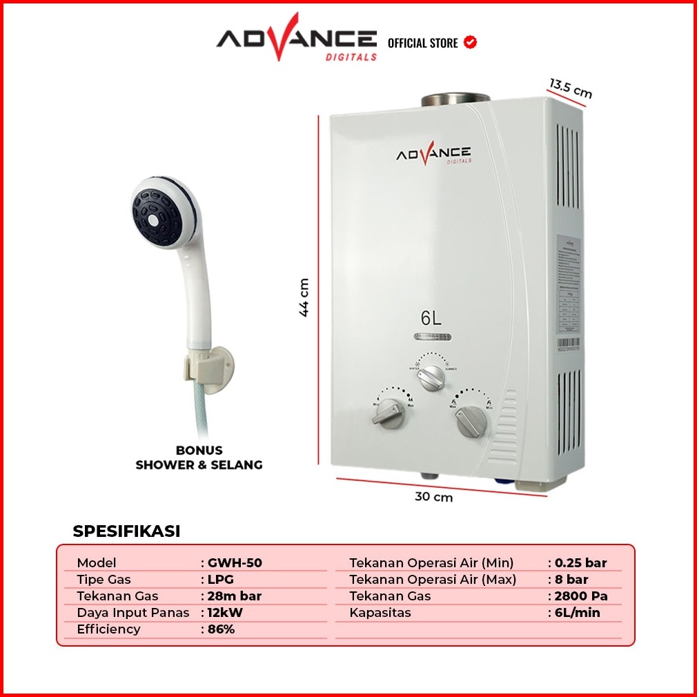 Advance Gwh50 Gas Water Heater Pemanas Air Kamar Mandi Gas Bonus Selang Dan Shower