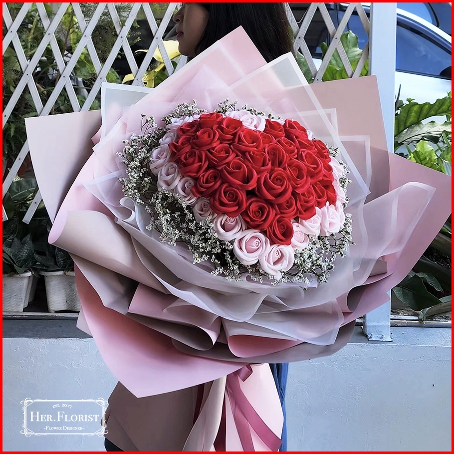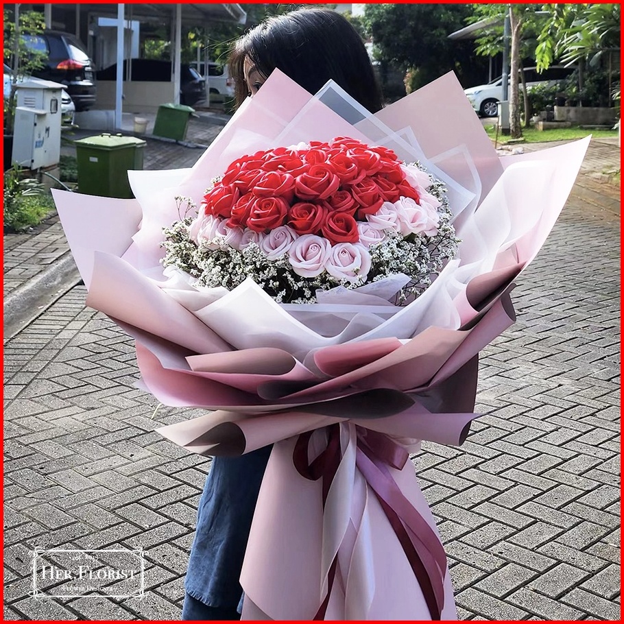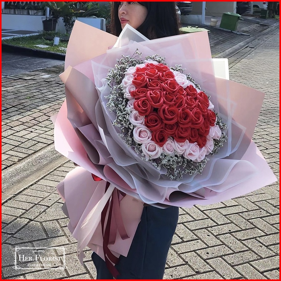 Her.florist Shape Of Love Rose Regular Soap Flower Limonium Flowers Bouquet Buket Bunga Sabun Bentuk Hati Hadiah Kado Va