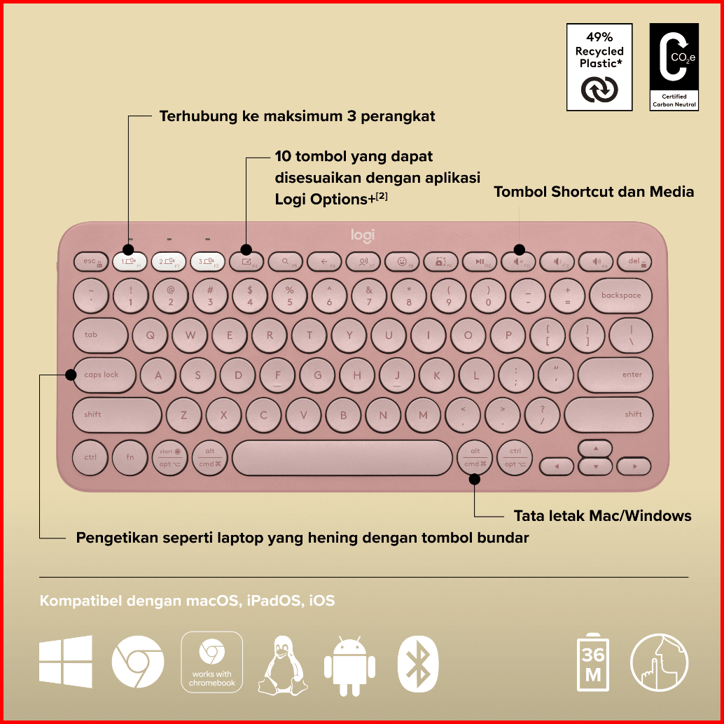 Logitech Pebble Keys 2 K380s Keyboard Wireless Bluetooth Multi Perangkat