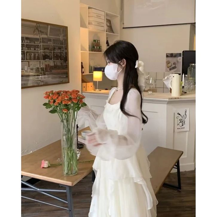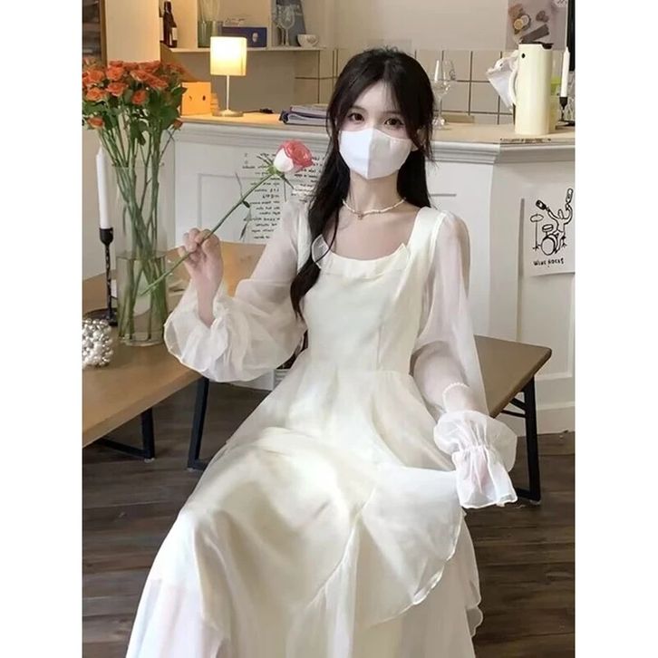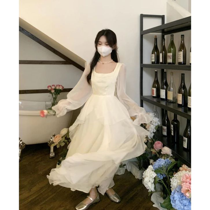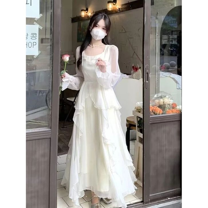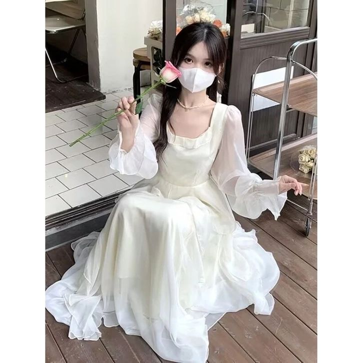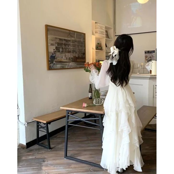 gaun putri peri putih lengan panjang gaun panjang dress wanita korea kekinian
