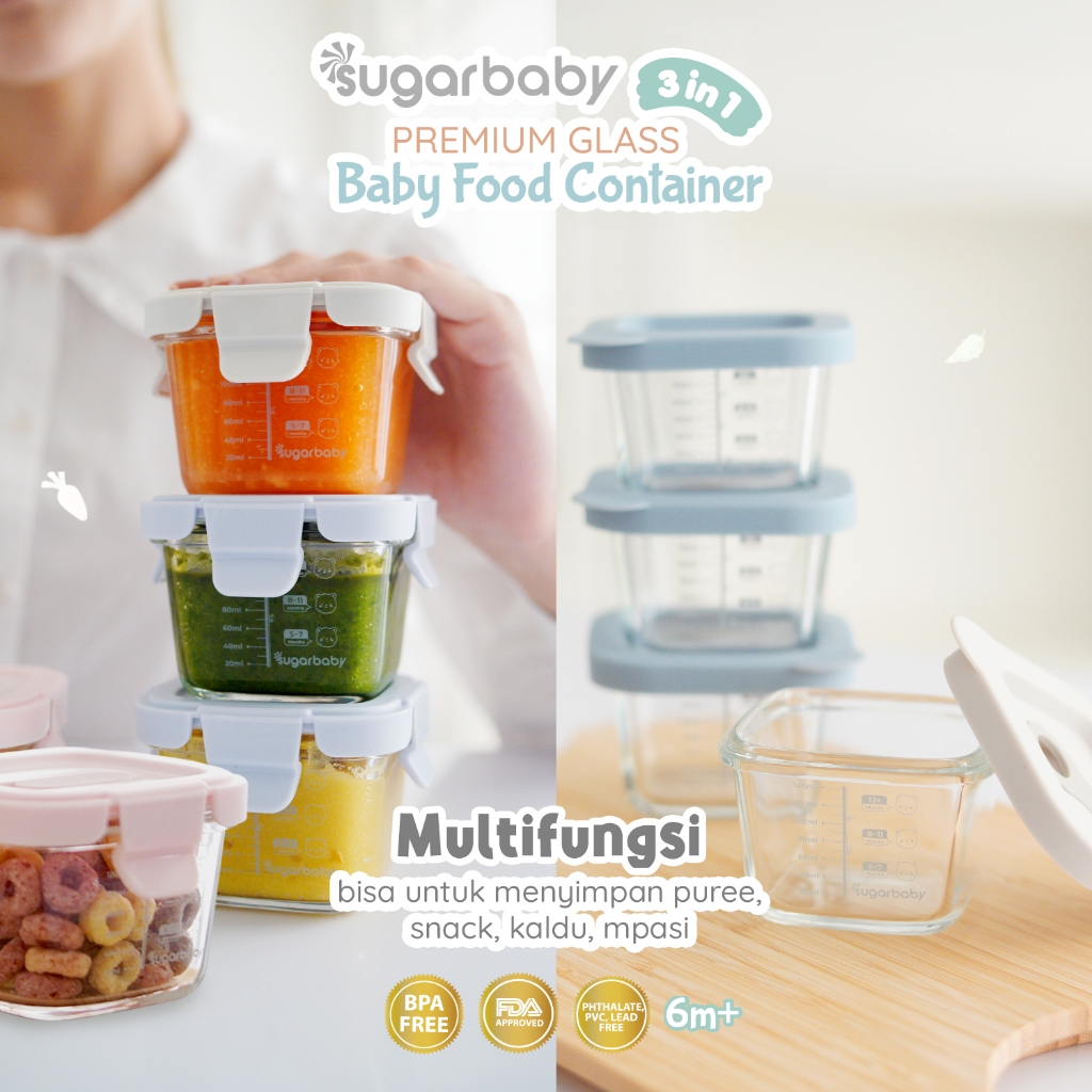 SugarBaby Premium Glass Jar Baby Food Container 3 Pcs BPA FREE Peralatan Makan Bayi MPASI Wadah Mangkok Bayi Silicon