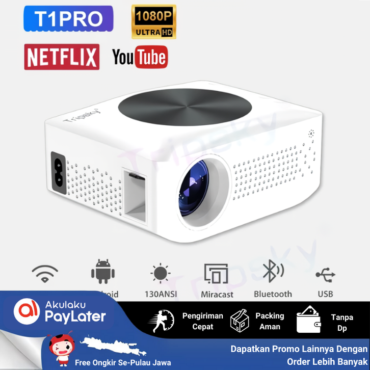 T1Pro Proyektor Mini Android 9.0 1080P Ram 2/16GB 5800 Lumens Layar Tancap Untuk Hp Projector Epson Hy300 Smoon Xgody