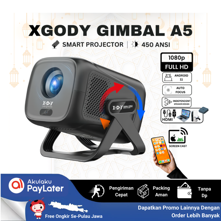 Xgody Proyektor Android Gimbal A5 FHD 1080P Mirrorlink 450 Ansi Layar Tancap Smart Projector Mini Epson Smoon HY300 HP