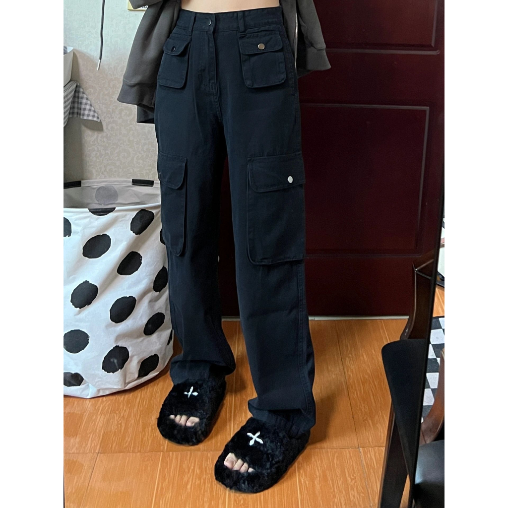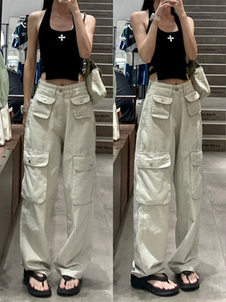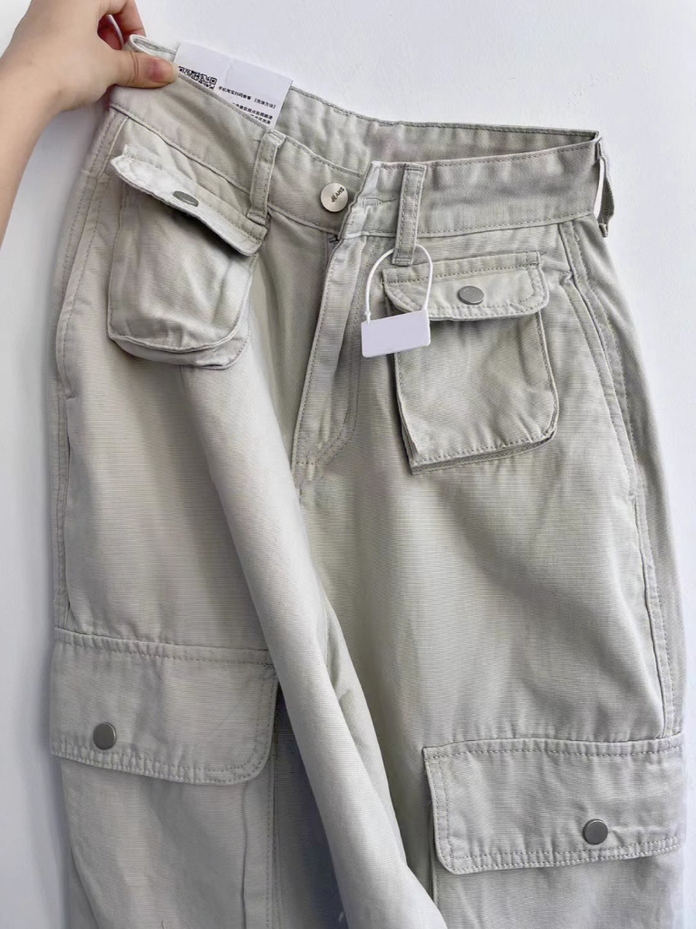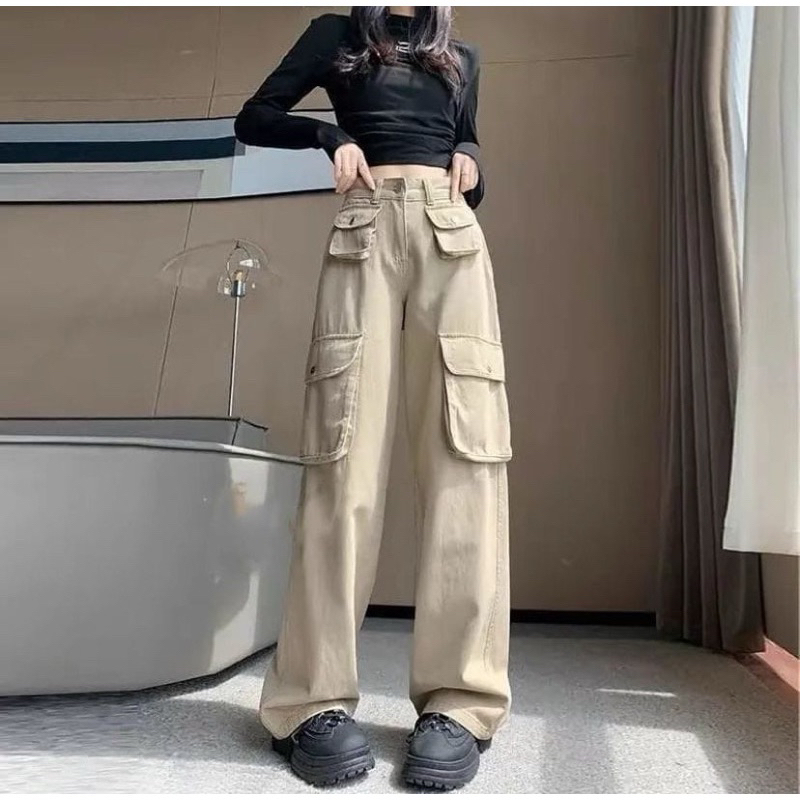 (Gratis Ongkir) LULU Putih Krem Highwaist Cargo Celana Jeans - Cargo Denim Pasir Putih Highwaist Loose Celana Jeans Wani