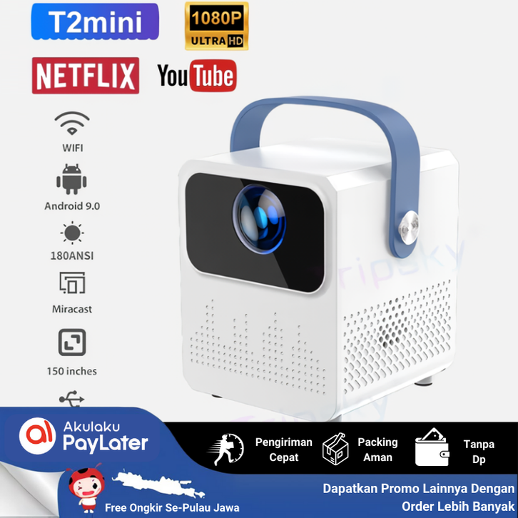 T2Mini Proyektor Mini Android 9.0 1080P 6000 Lumens Ram 2/16GB Layar Tancap Untuk Hp Projector Epson Hy300 Smoon Xgody