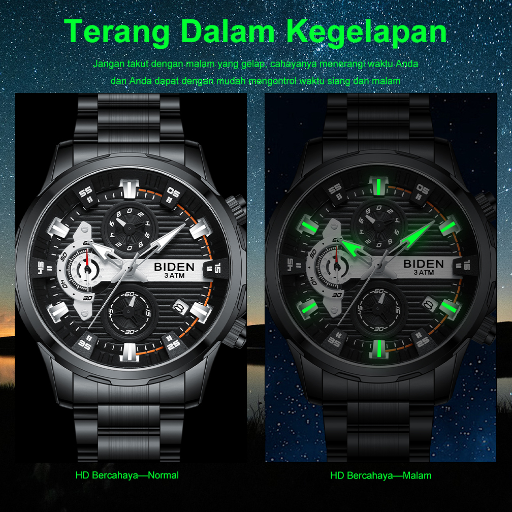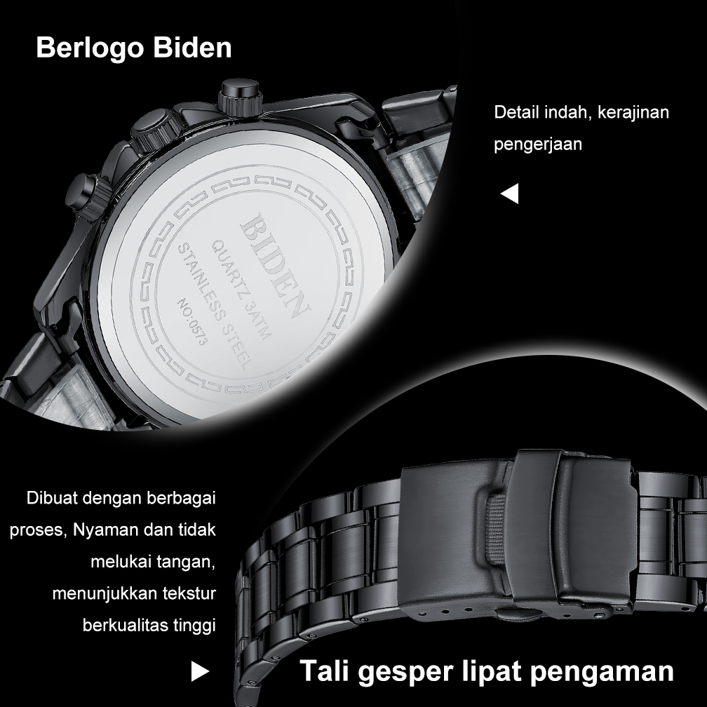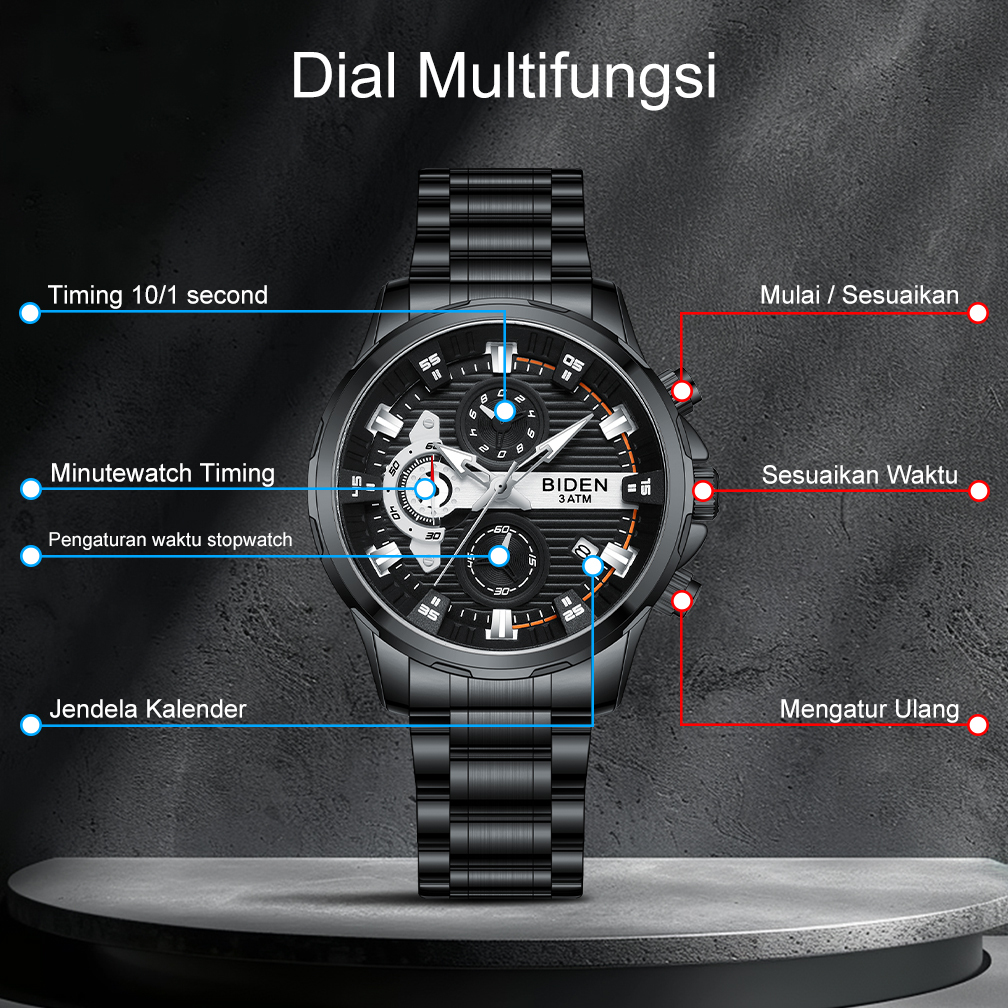 Jam Tangan Pria Anti Air Original BIDEN Kronograf Multifungsi Kalender Tali Stainless Steel Olahraga