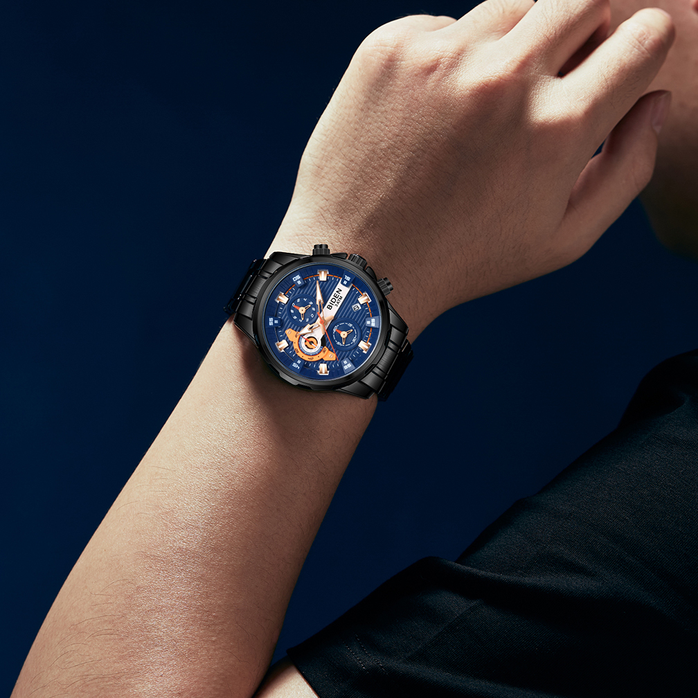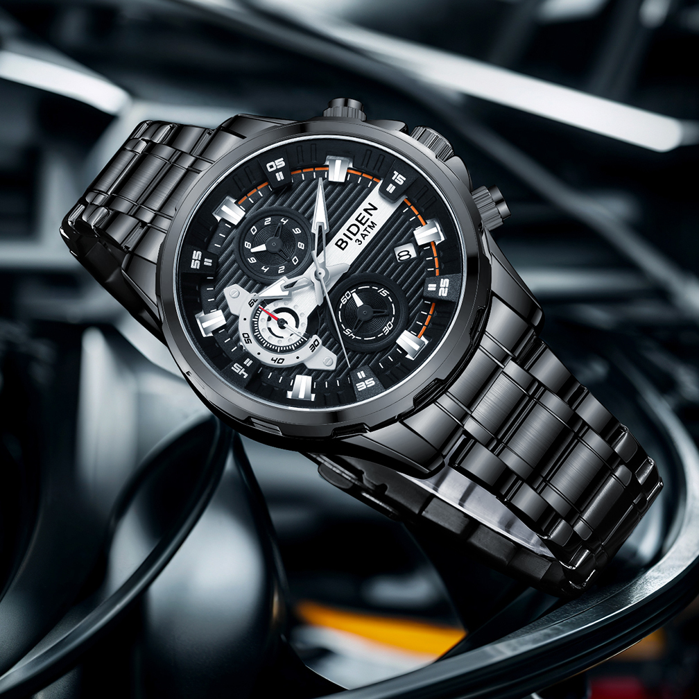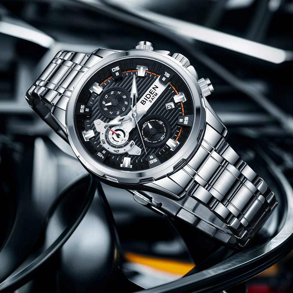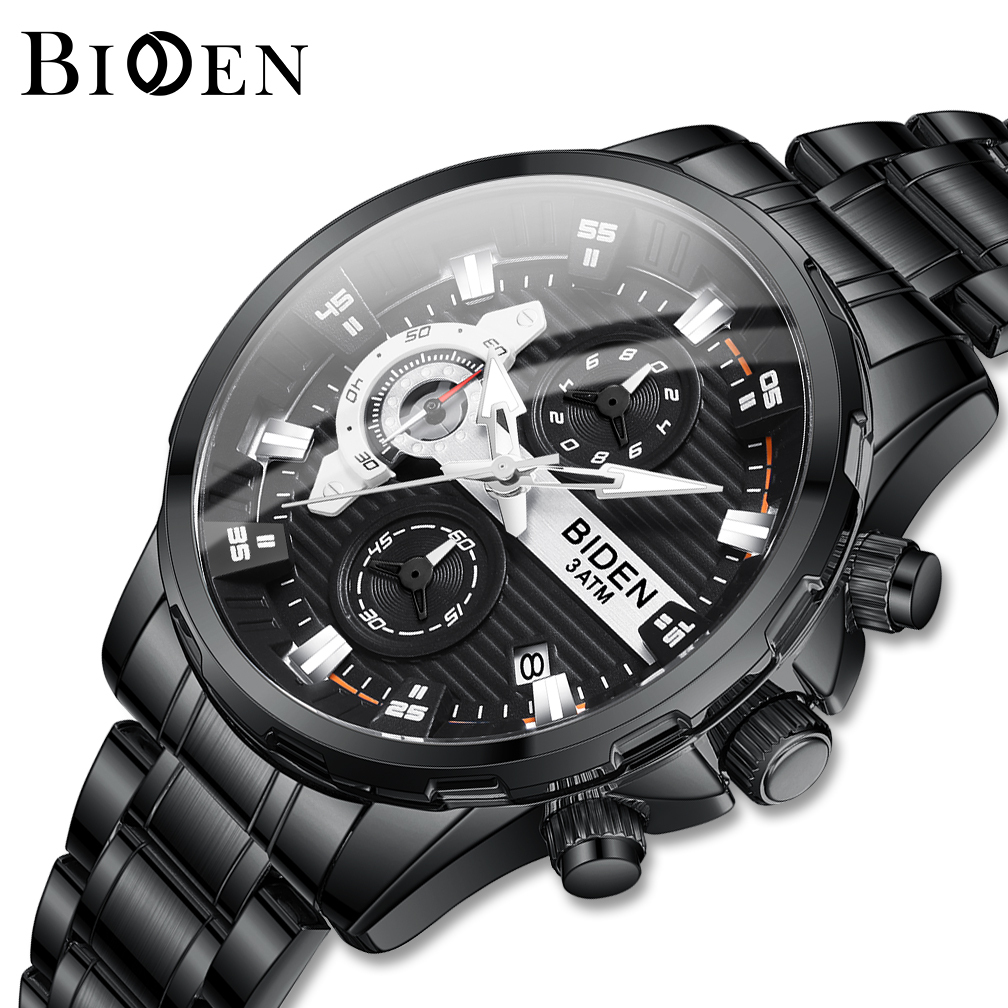 Jam Tangan Pria Anti Air Original BIDEN Kronograf Multifungsi Kalender Tali Stainless Steel Olahraga