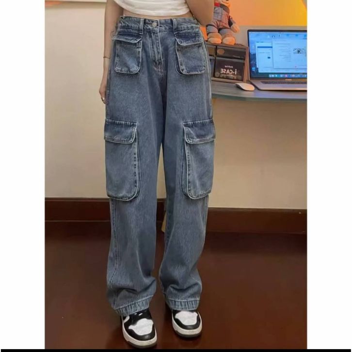 (Gratis Ongkir) LULU Putih Krem Highwaist Cargo Celana Jeans - Cargo Denim Pasir Putih Highwaist Loose Celana Jeans Wani