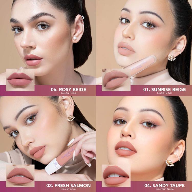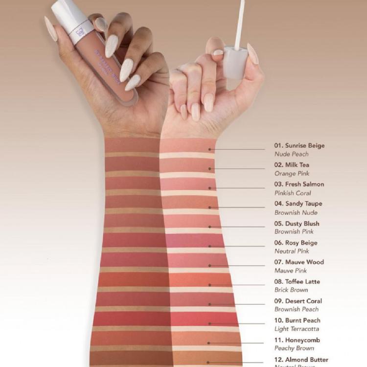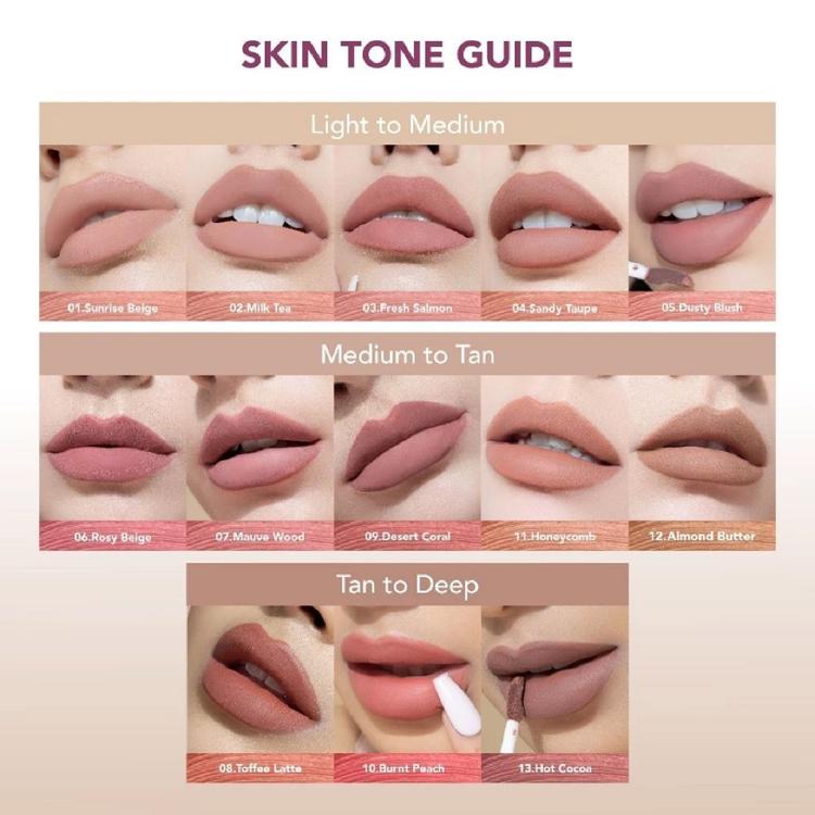 01. Sunrise Beige, 02. Milk Tea, 03. Fresh Salmon, 04. Sandy Taupe, 05. Dusty Blush, 06. Rosy Beige, 07. Mauve Wood, 08. Toffee Latte, 09. Desert Coral, 10. Burnt Peach, 11. Honeycomb, 12. Almond Butter, 13. Hot Cocoa