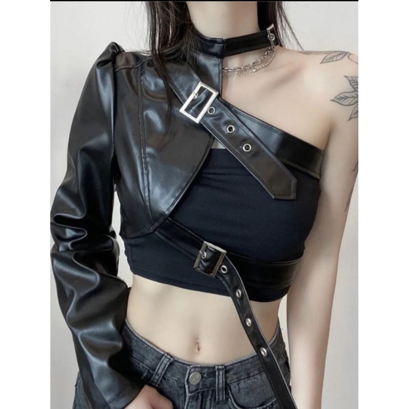 Jaket crop kulit wanita vintage by Khalifa /Leather Crop Tops Jacket Singgel One Shoulder Woman Fashion