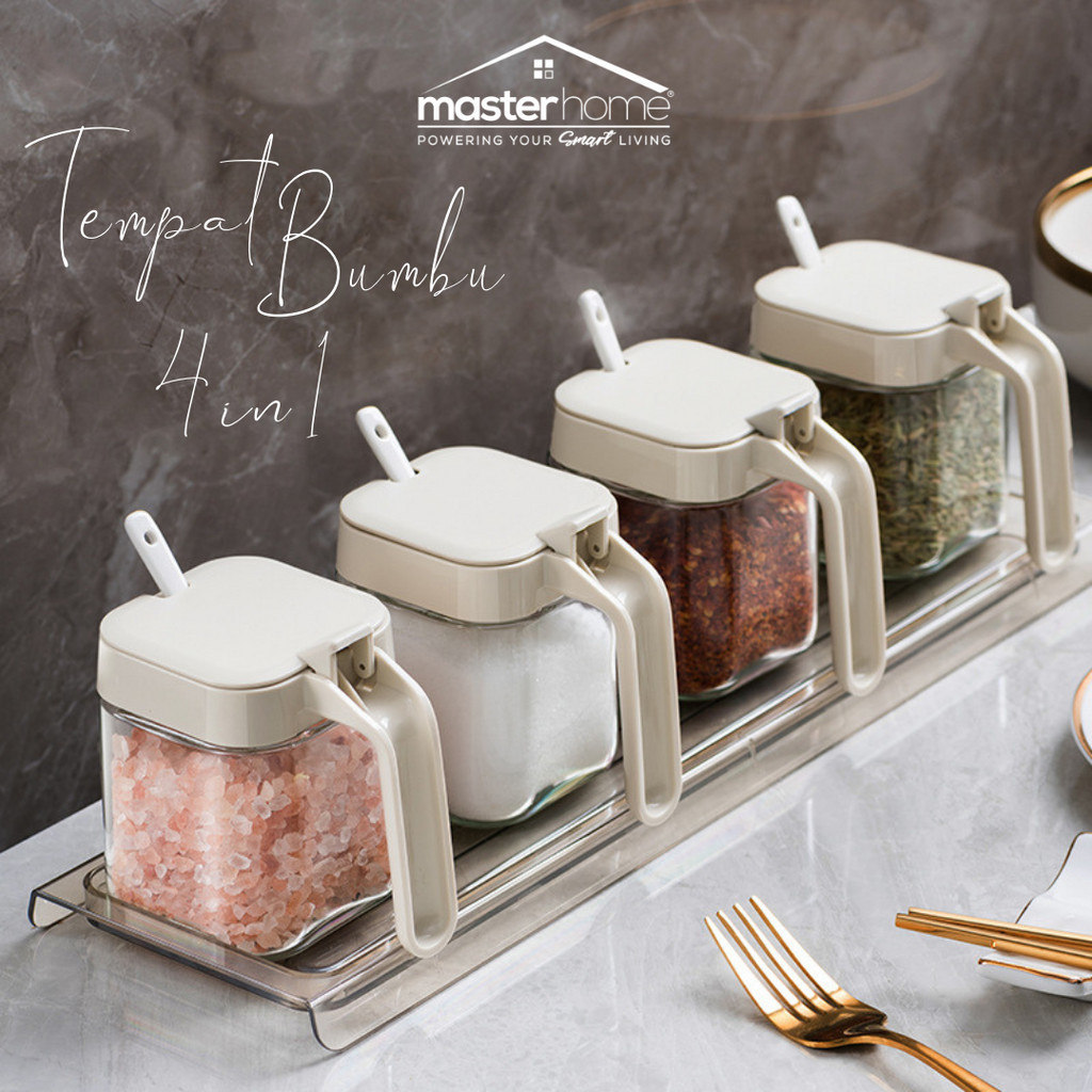 TEMPAT BUMBU KACA MASTERHOME DENGAN NAMPAN 4IN1 FREE SENDOK | KOTAK BUMBU DAPUR DENGAN PEGANGAN | SEASONING BOX SAUCE
