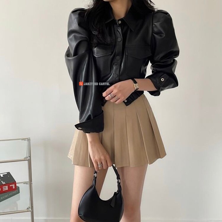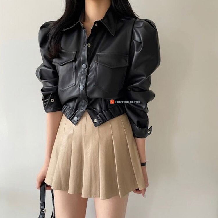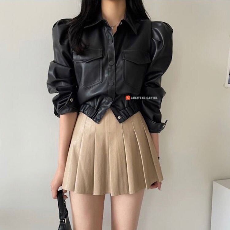 JNK x LUVI - Jaket Mantel Wanita Kulit Imitasi Hitam Bahan Semi Kulit Sintetis Viena Faux Synthetic Leather Jacket Shirt