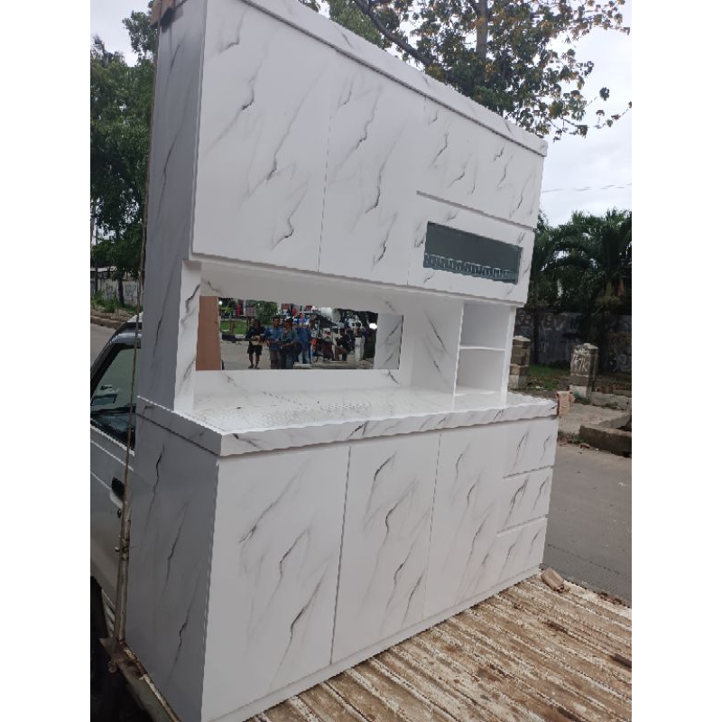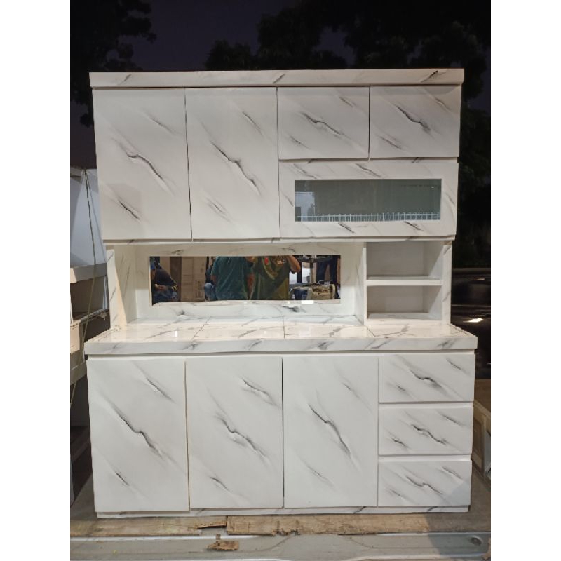rak piring lemari sayur kayu dapur minimalis hidrolik pintu Sorong sleding cermin keramik laci 3 rell. motif matmer.. we