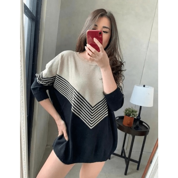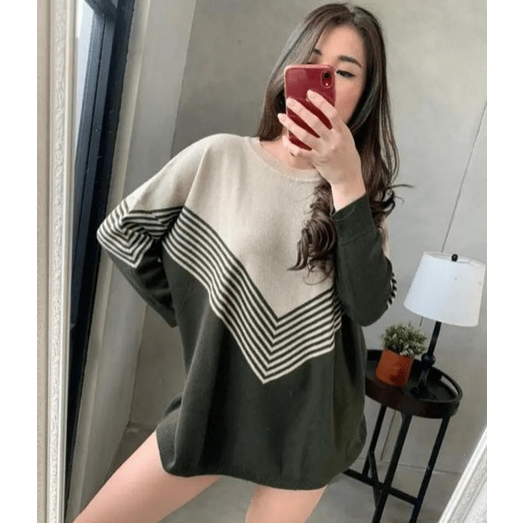 Elzo Bara Rajut Oversize - Baju Atasan Wanita Bahan Rajut Premium Tebal Motif Stripe - Sweater Terbaru