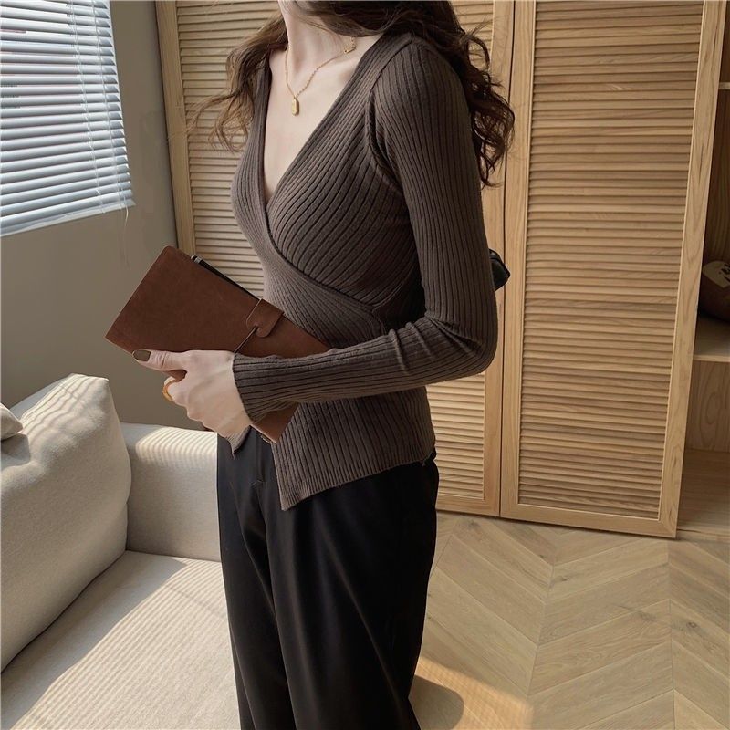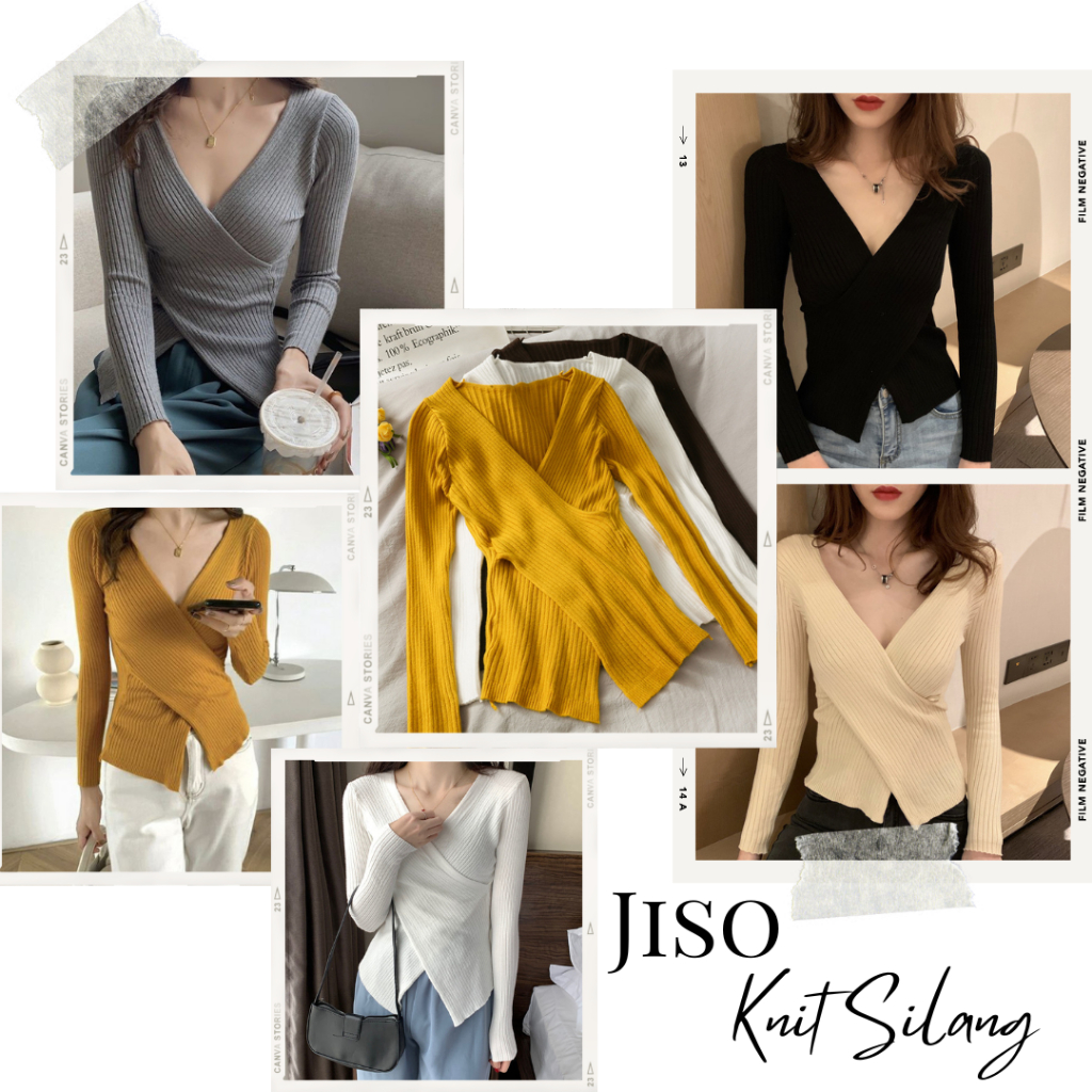 Atasan Silang Jiso top wrap korean style v neck atasan rajut wanita lengan panjang -#OMB