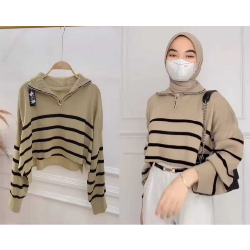 Terlaris Di Sweater Rajut Wanita - Sweater Knit Striped Zipper Crop Premium Size Jumbo BB 40Kg-90Kg