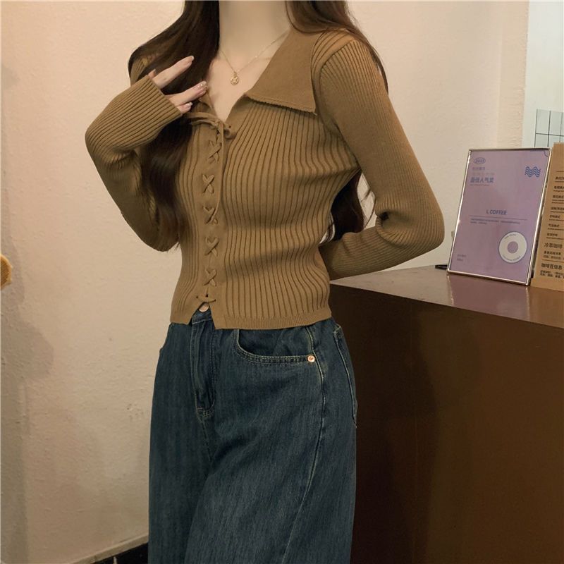 Kaos BerKerah Polo Polos el Tali - Atasan Kaus Rajut Lengan Panjang Korean Style Knit Stripe T-shirt