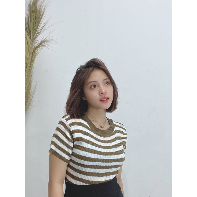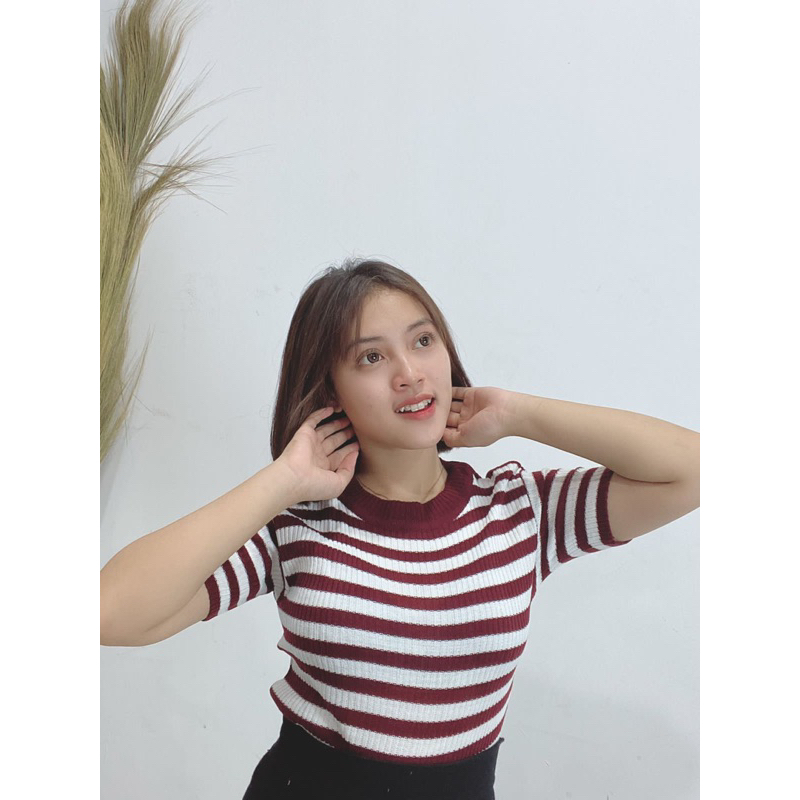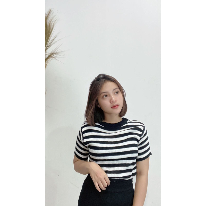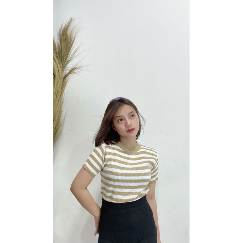 Blouse Rajut Salur | Atasan wanita Stripe Lengan Pendek