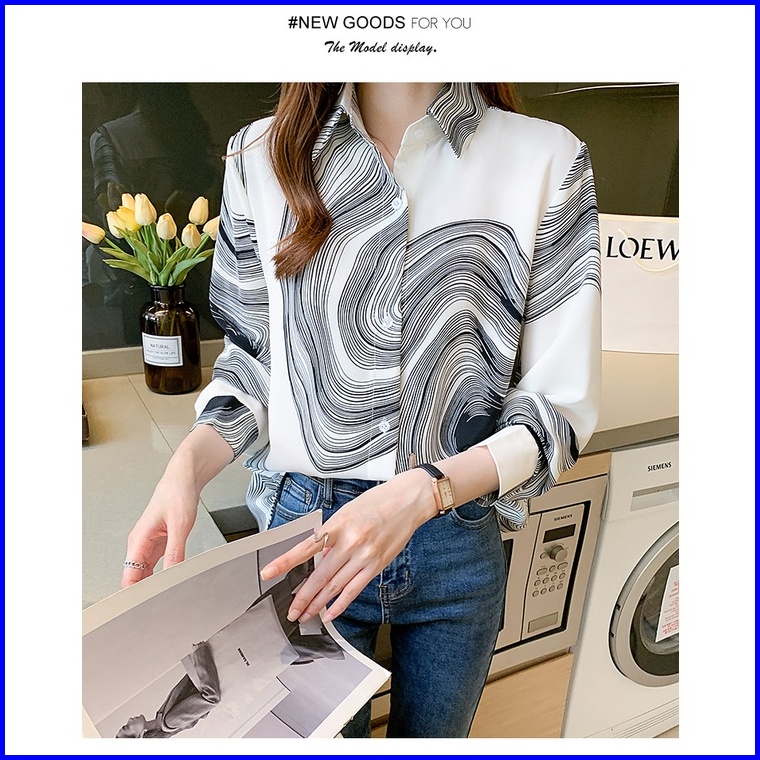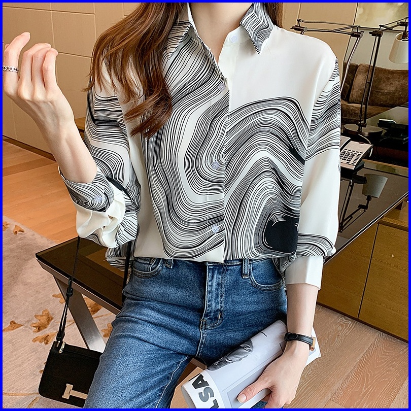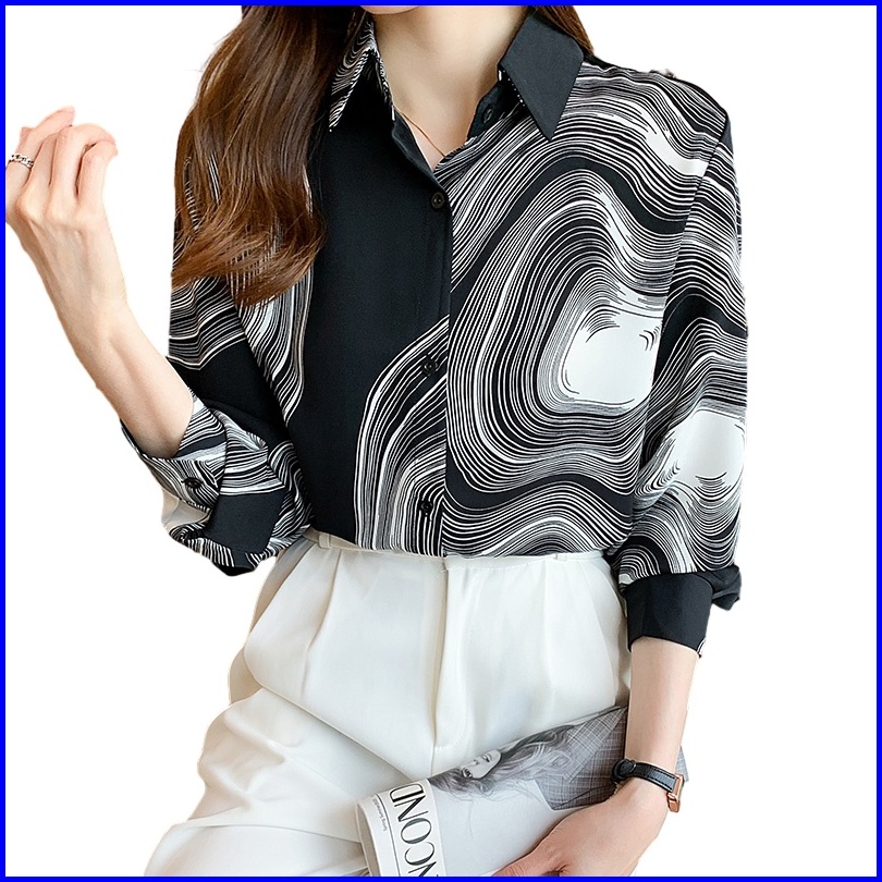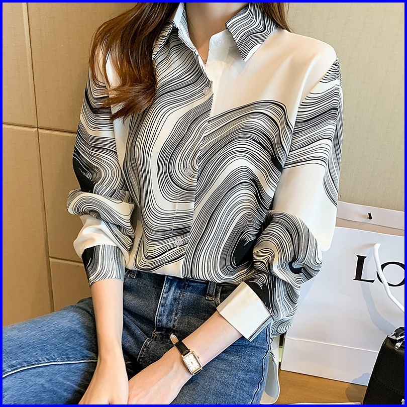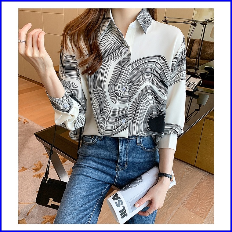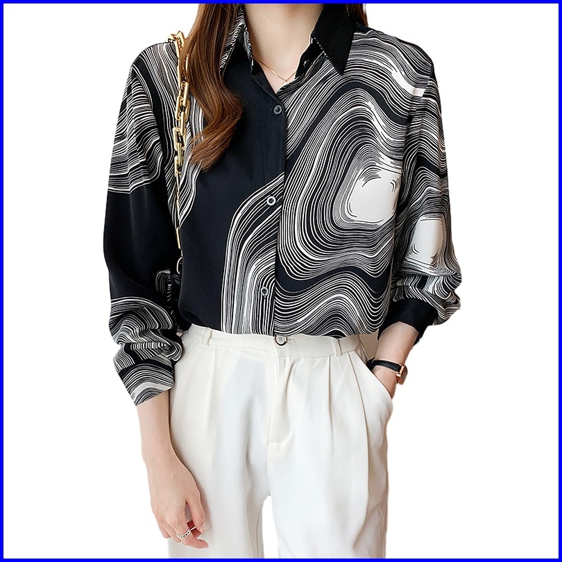 Kualitas Tinggi Cetak Garis Geometris Hitam Dan Putih Kemeja Wanita Lengan Panjang Model Street Fashion Atasan Kerja Pes