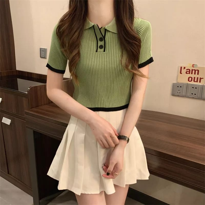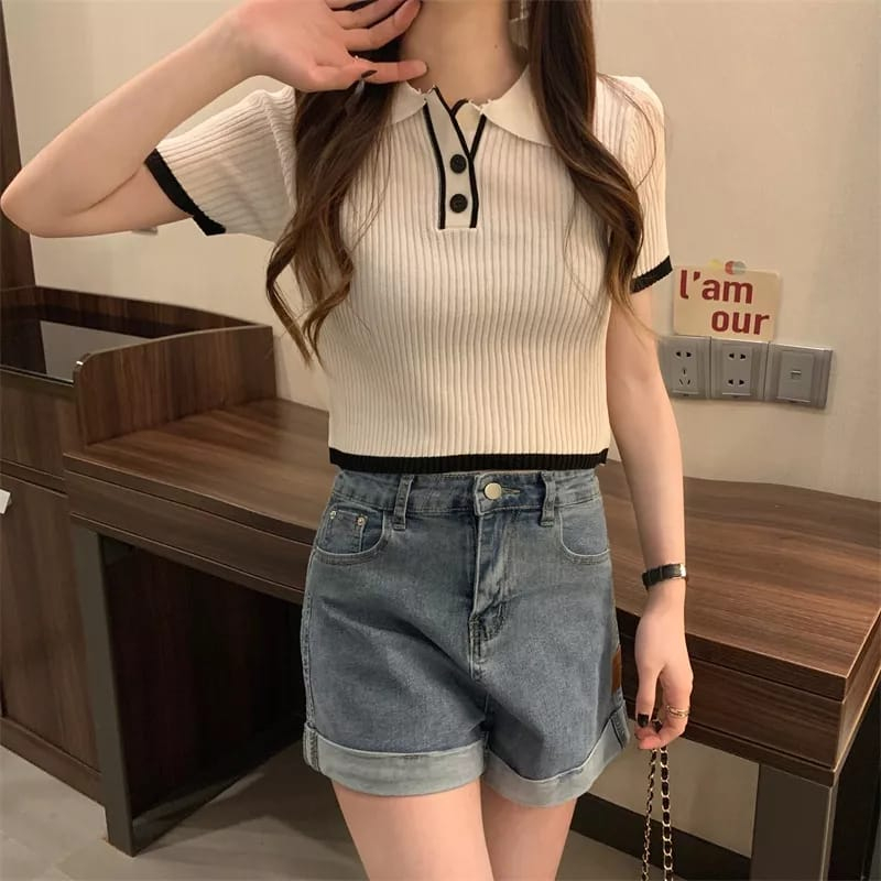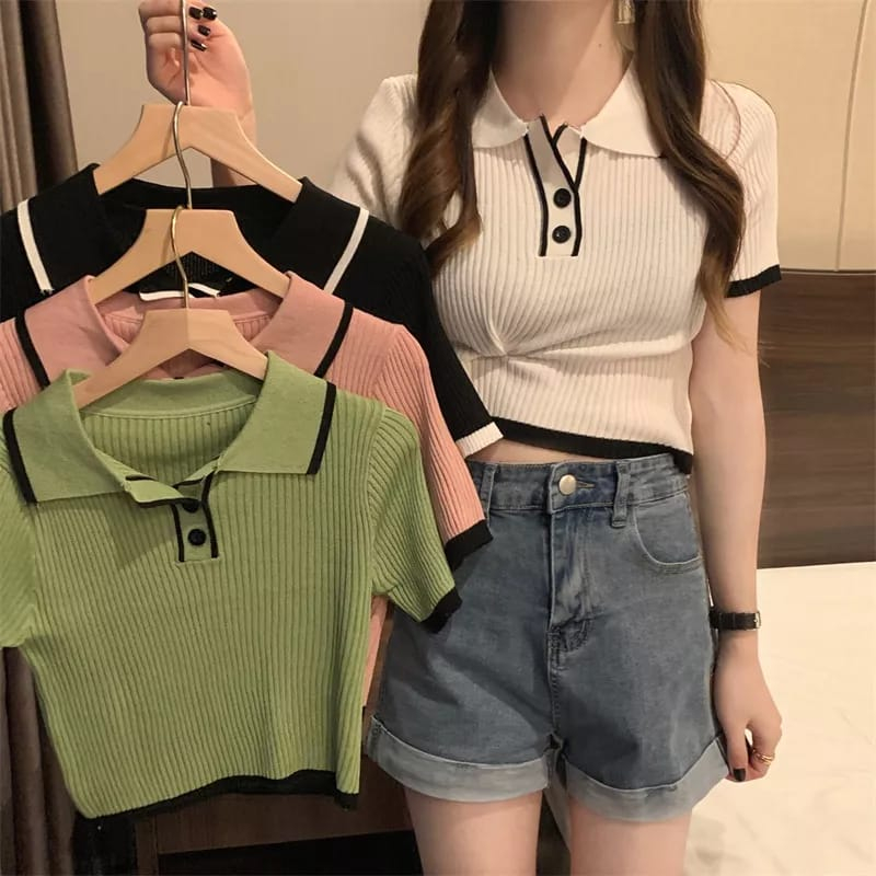 Kaos Kerah Polo Crop Top Rajutan Harajuku Pakaian Crop Wanita T-shirt Putih Solid Lengan Pendek Shirring Wanita Blus Per